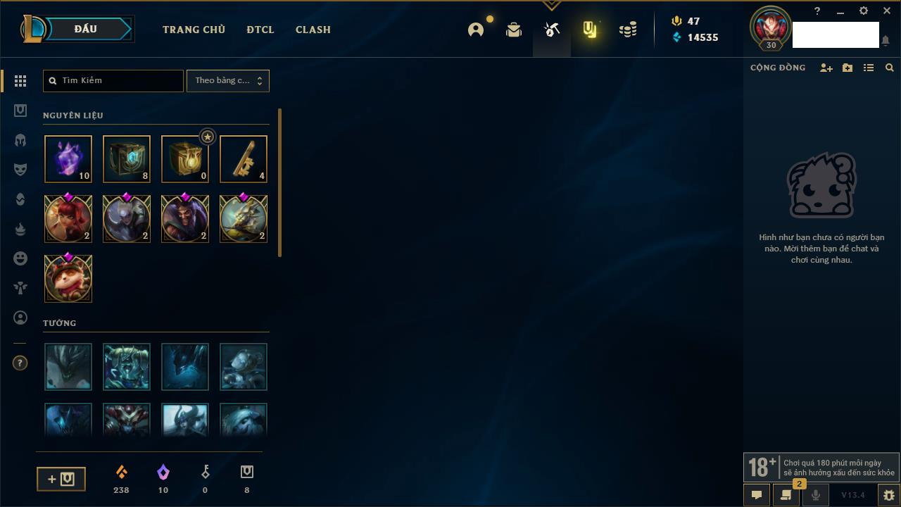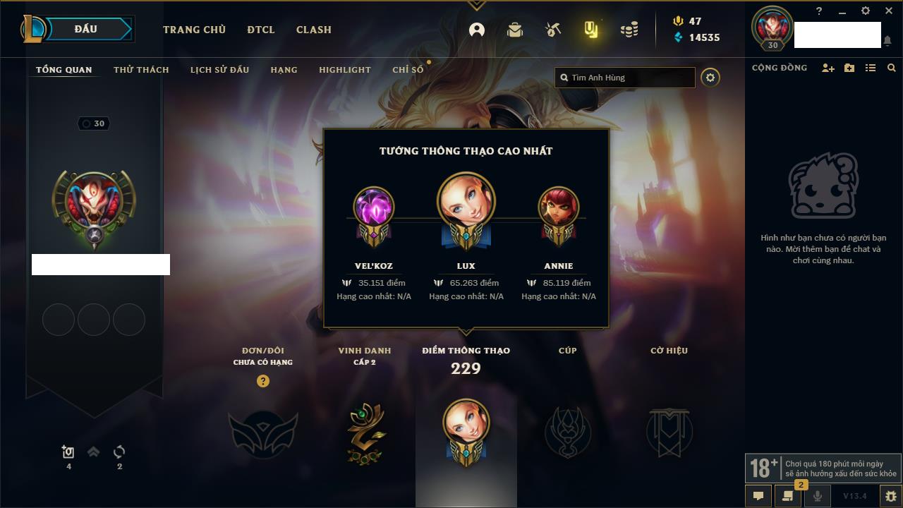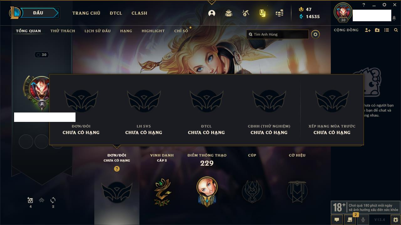 Rank Đơn: Vàng IKhung: BạcTướng: 171 - Còn 60584 THXTrang Phục: 286Rank ĐTCL: Vàng IIILinh Thú: 117