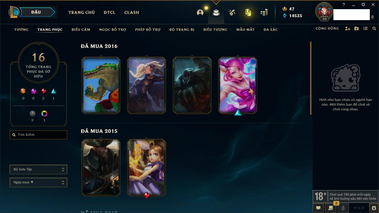 Rank Đơn: Vàng IIIKhung: VàngTướng: 171 - Còn 88128 THXTrang Phục: 329Rank ĐTCL: Chưa RankLinh Thú: 41