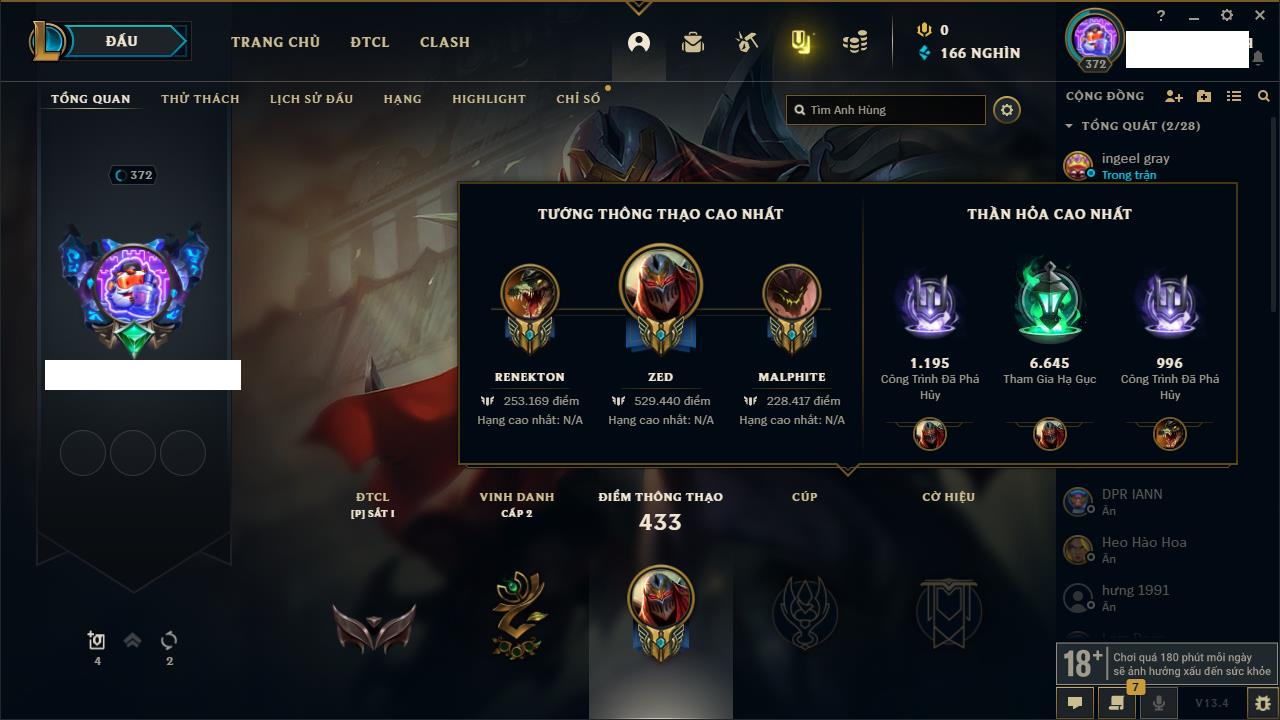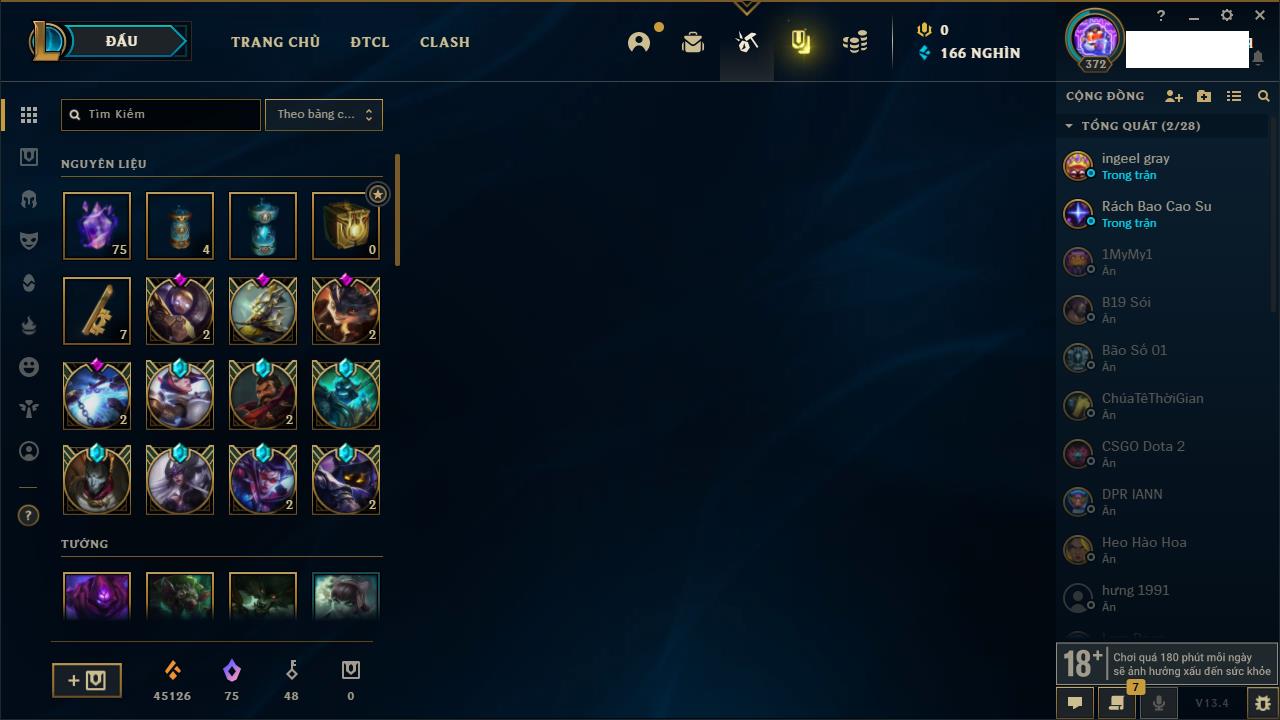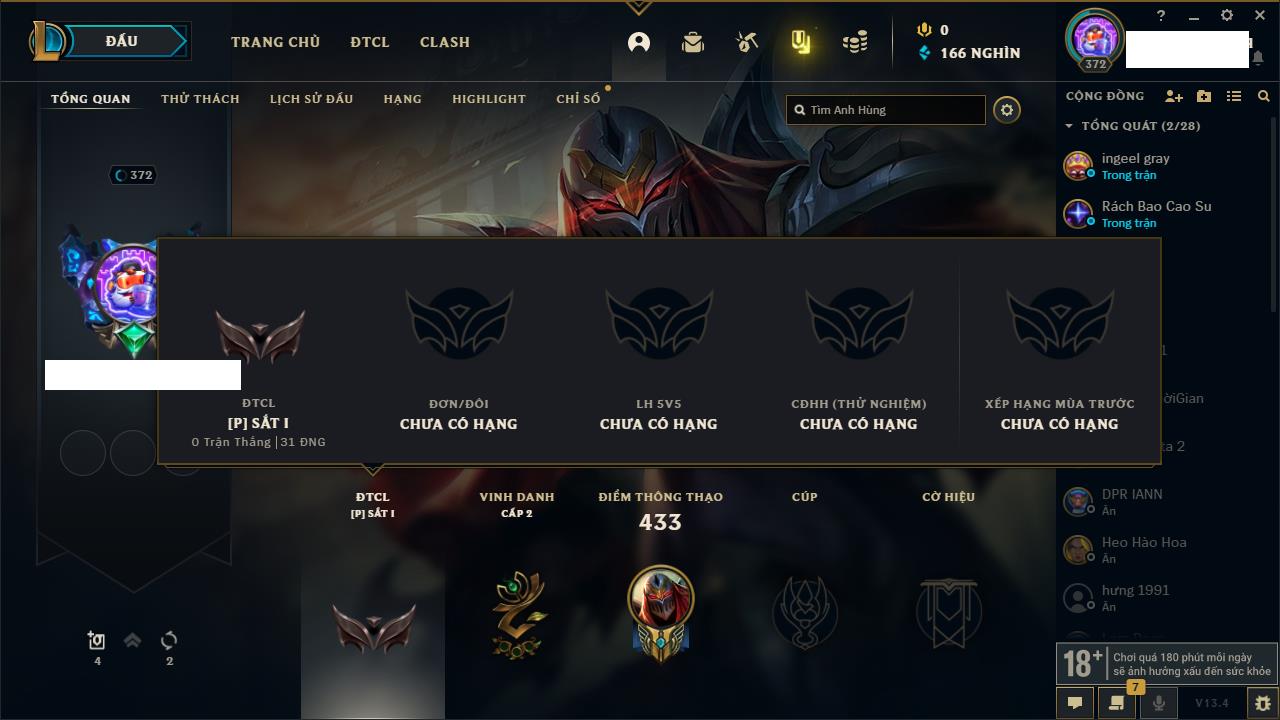 Rank Đơn: Đồng IIKhung: Chưa có khungTướng: 170 - Còn 56487 THXTrang Phục: 90Rank ĐTCL: Chưa RankLinh Thú: 129