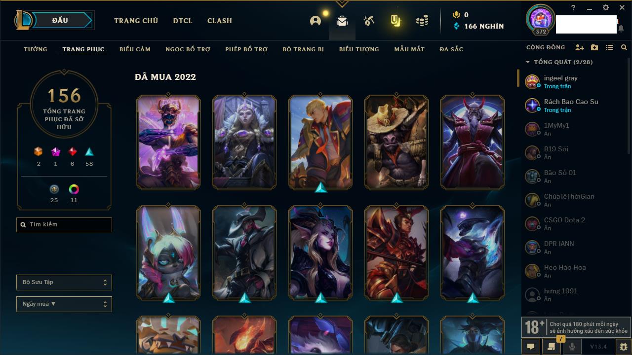 Rank Đơn: Vàng IIIKhung: VàngTướng: 170 - Còn 33222 THXTrang Phục: 136Rank ĐTCL: Chưa RankLinh Thú: 40