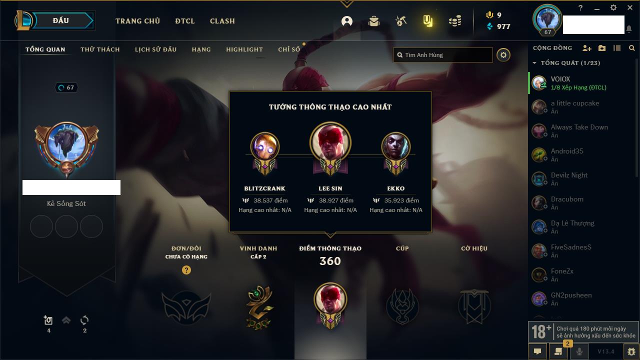 Rank Đơn: Bạch Kim IIKhung: Bạch kimTướng: 171 - Còn 141298 THXTrang Phục: 274Rank ĐTCL: Bạch Kim IILinh Thú: 188