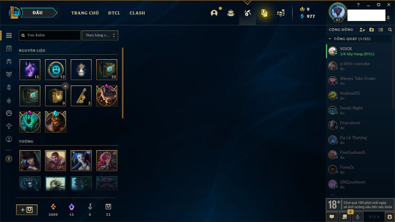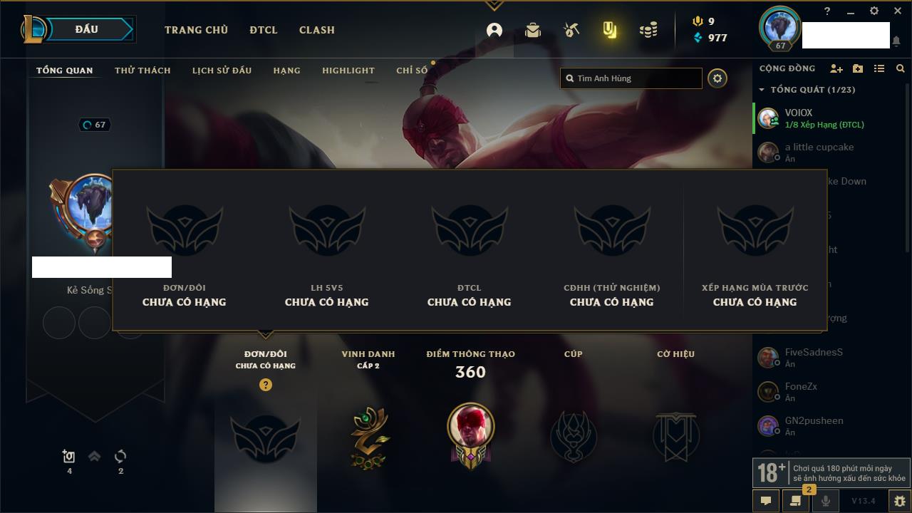 Rank Đơn: Vàng IKhung: BạcTướng: 171 - Còn 60584 THXTrang Phục: 286Rank ĐTCL: Vàng IIILinh Thú: 117
