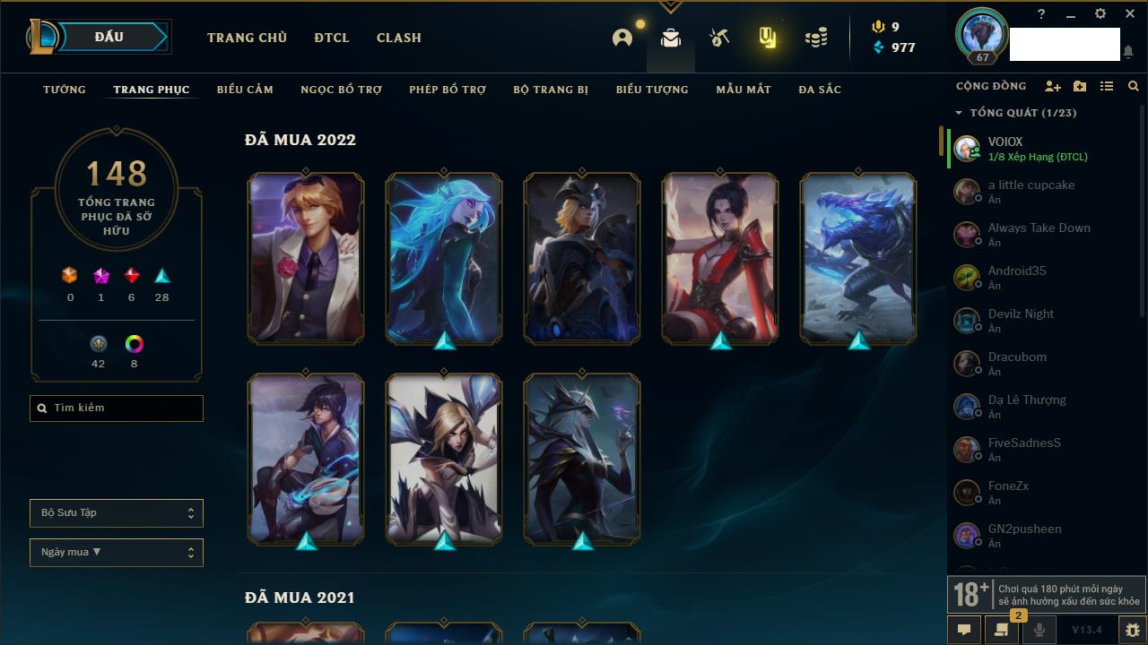 Rank Đơn: Vàng IIIKhung: VàngTướng: 171 - Còn 88128 THXTrang Phục: 329Rank ĐTCL: Chưa RankLinh Thú: 41