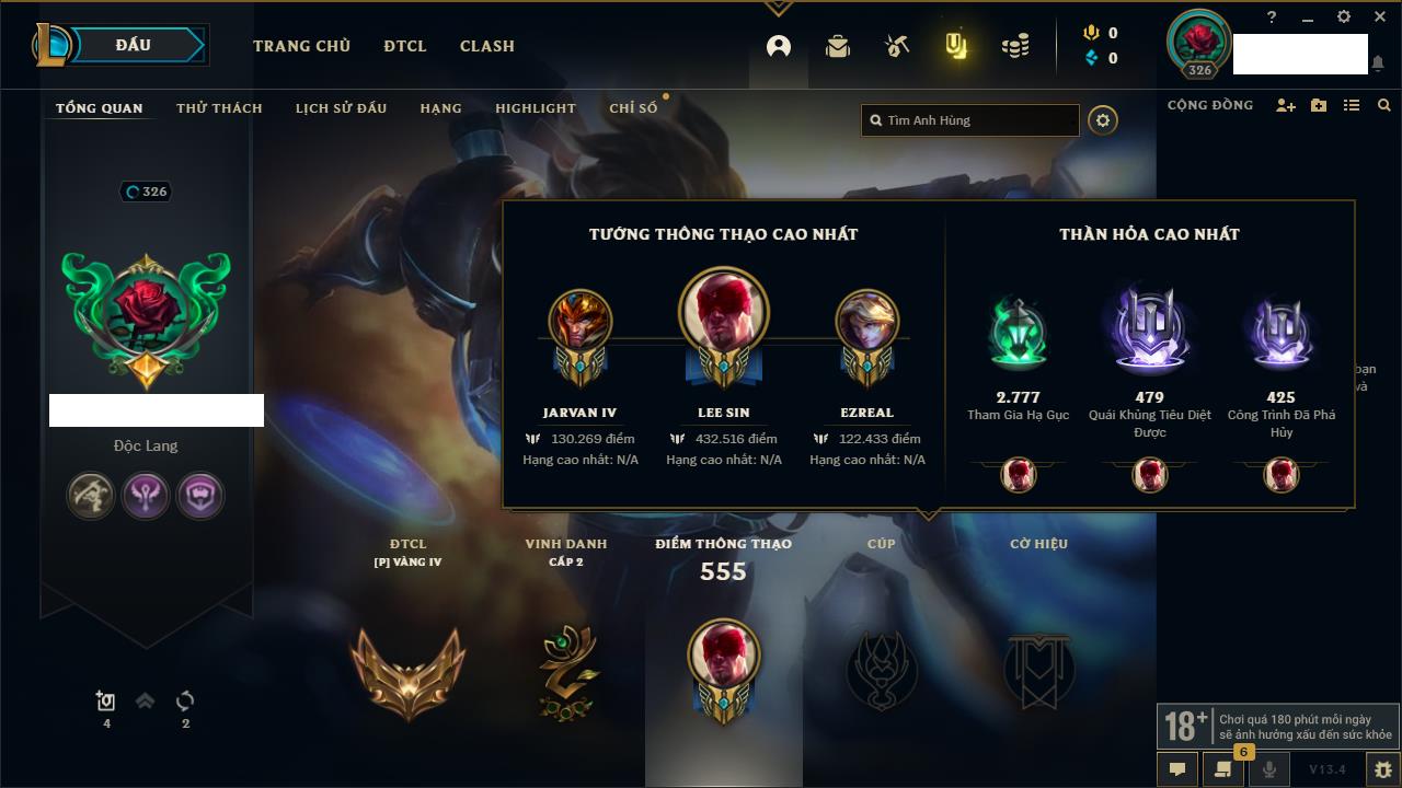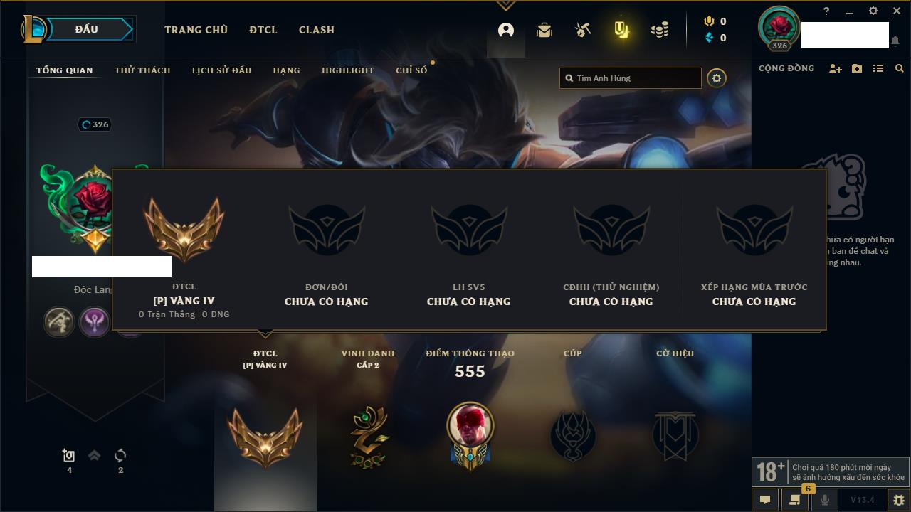 Rank Đơn: Vàng IVKhung: VàngTướng: 146 - Còn 89110 THXTrang Phục: 63Rank ĐTCL: Vàng IIILinh Thú: 41