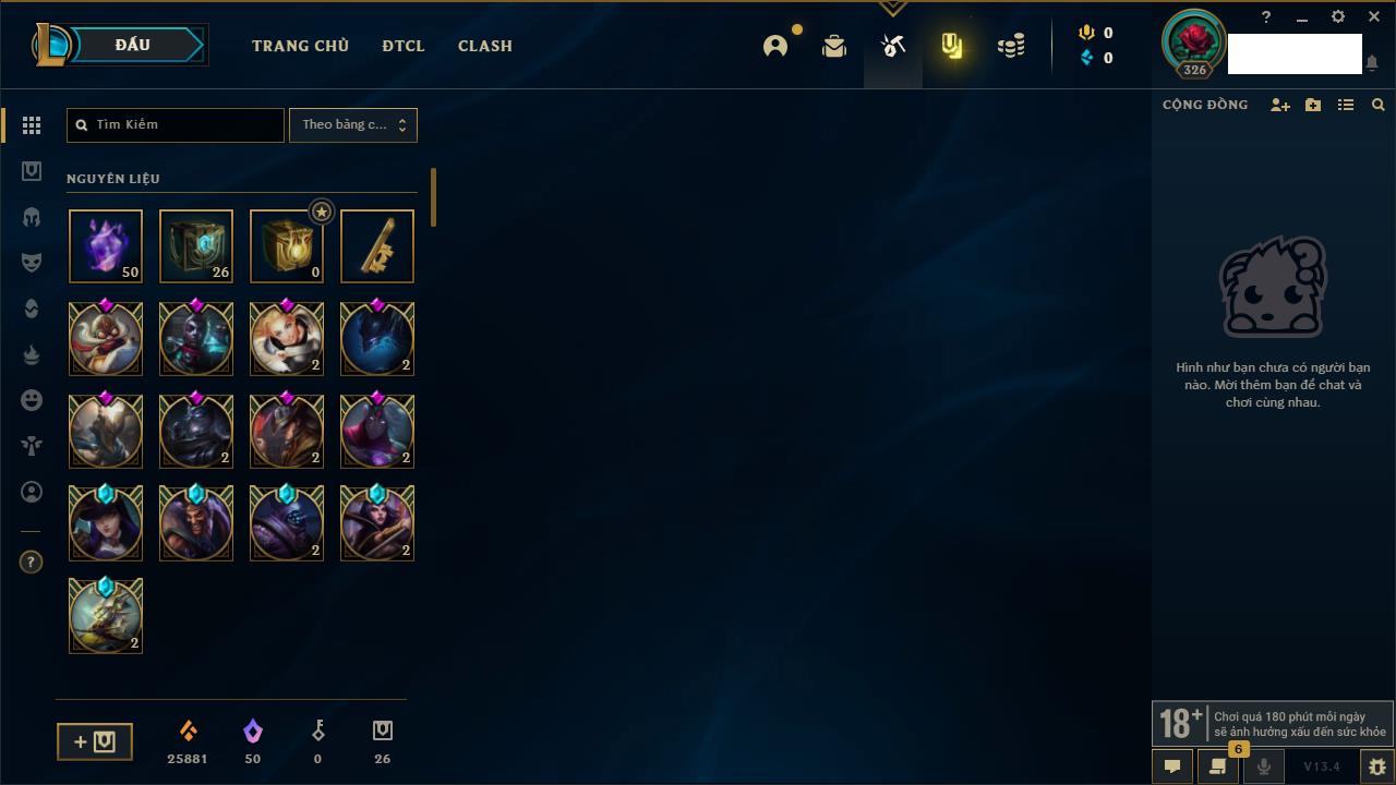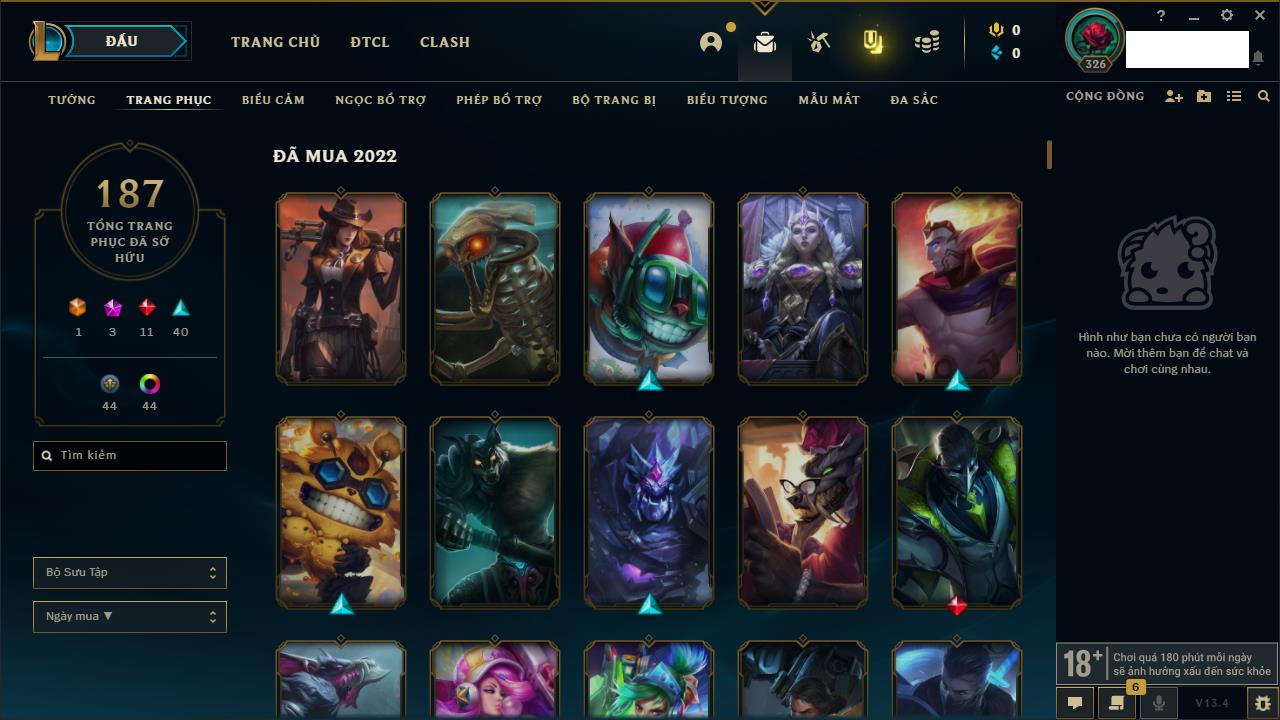 Rank Đơn: Đồng IIKhung: Chưa có khungTướng: 170 - Còn 56487 THXTrang Phục: 90Rank ĐTCL: Chưa RankLinh Thú: 129
