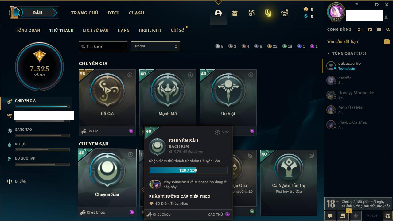 Rank Đơn: Vàng IVKhung: BạcTướng: 166 - Còn 180925 THXTrang Phục: 163Rank ĐTCL: Chưa RankLinh Thú: 67