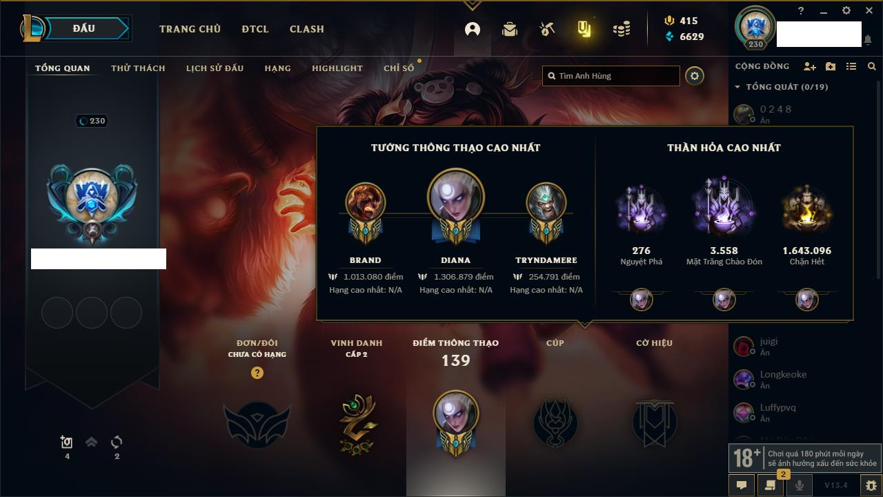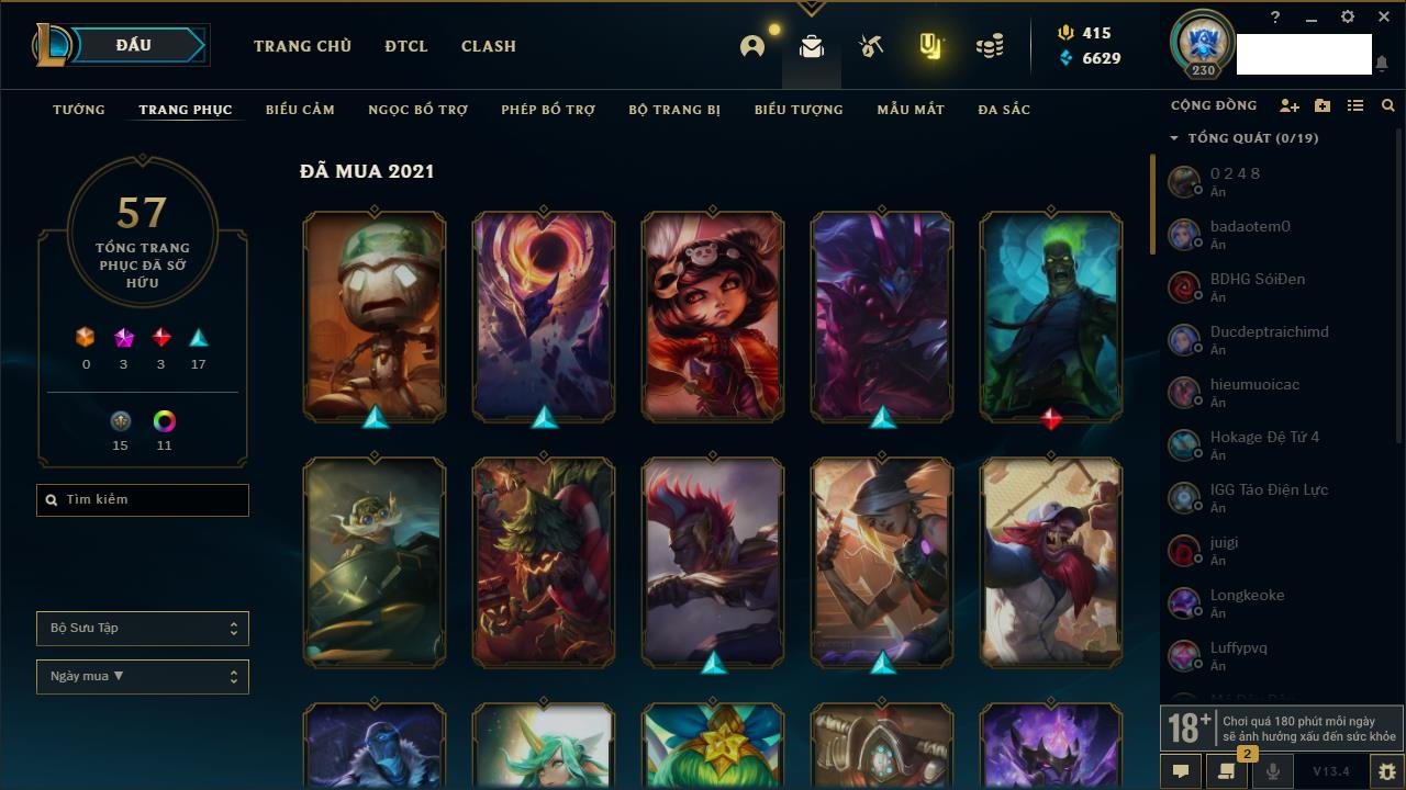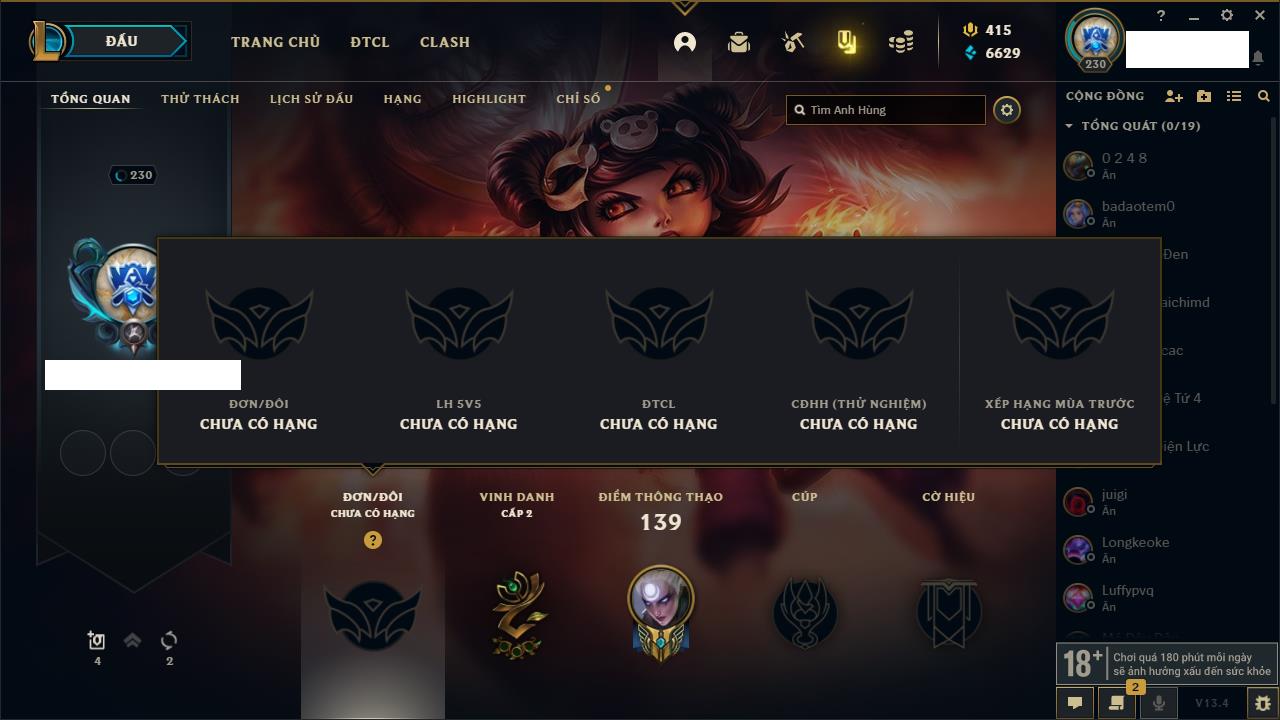 Rank Đơn: Bạc IIKhung: Bạch kimTướng: 169 - Còn 81813 THXTrang Phục: 301Rank ĐTCL: Chưa RankLinh Thú: 140