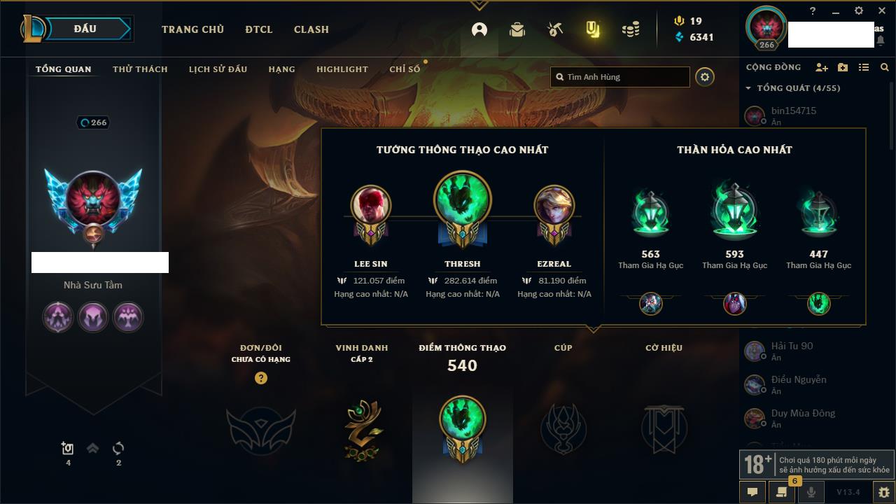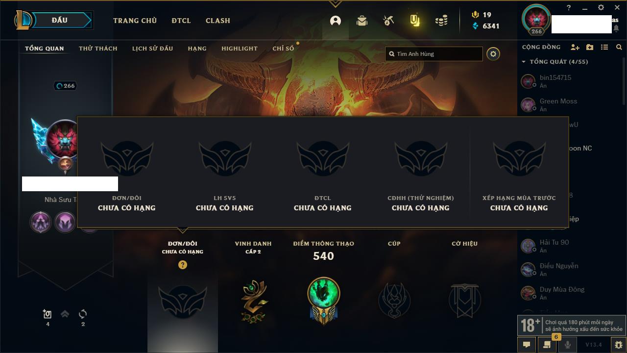Rank Đơn: Lục Bảo IVKhung: Chưa có khungTướng: 171 - Còn 165973 THXTrang Phục: 160Rank ĐTCL: Chưa RankLinh Thú: 9