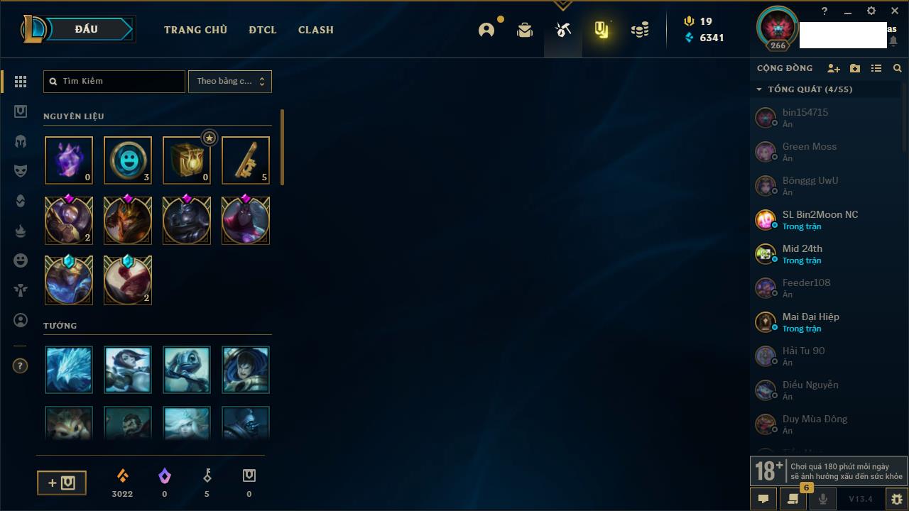 Rank Đơn: Vàng IIKhung: VàngTướng: 171 - Còn 34018 THXTrang Phục: 250Rank ĐTCL: Sắt IILinh Thú: 19