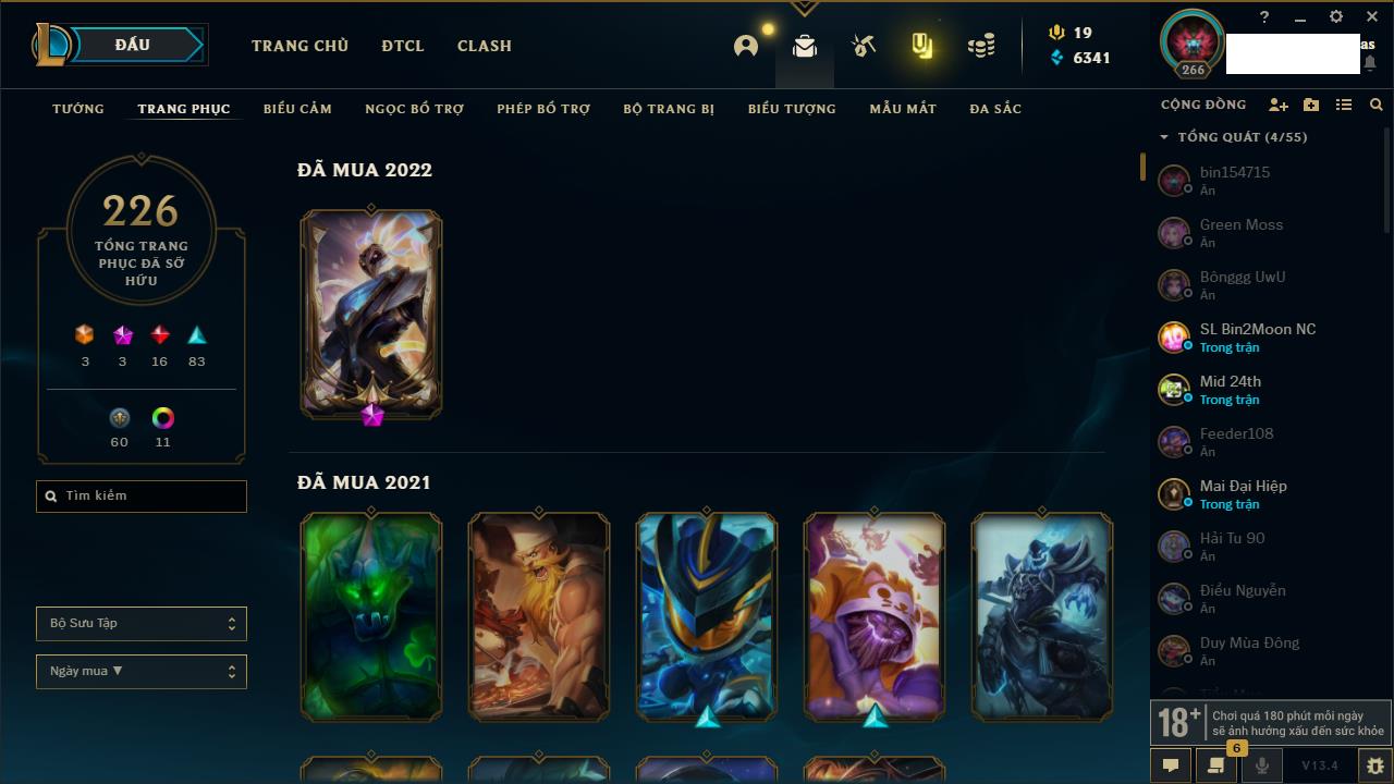 Rank Đơn: Bạc IVKhung: BạcTướng: 171 - Còn 7819 THXTrang Phục: 243Rank ĐTCL: Chưa RankLinh Thú: 102