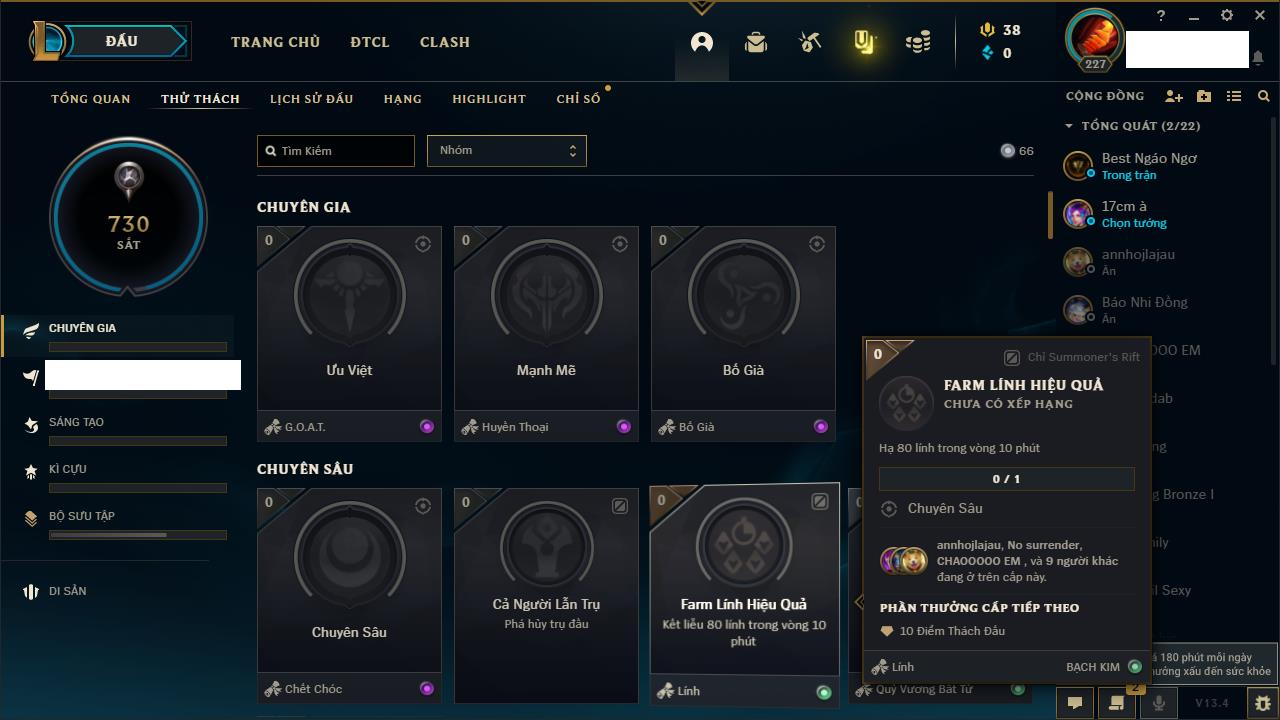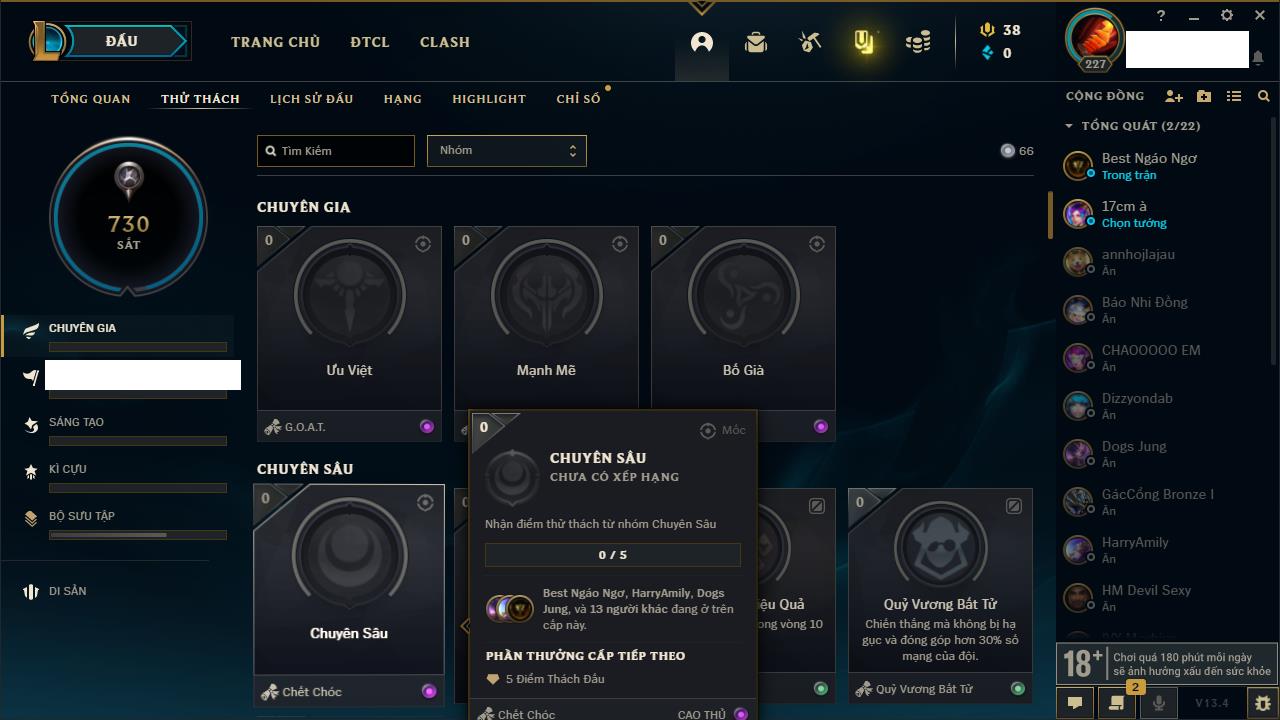 Rank Đơn: Đồng IIKhung: ĐồngTướng: 170 - Còn 66145 THXTrang Phục: 215Rank ĐTCL: Chưa RankLinh Thú: 52
