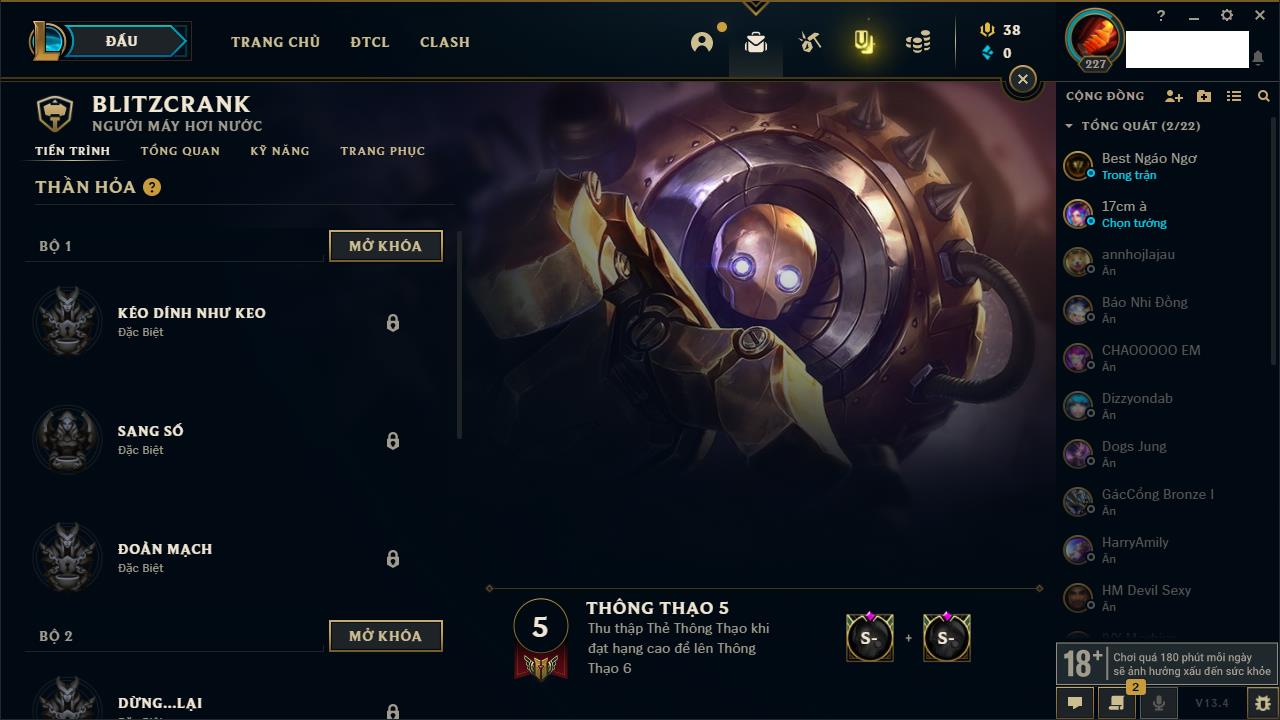 Rank Đơn: Đồng IKhung: ĐồngTướng: 168 - Còn 11447 THXTrang Phục: 245Rank ĐTCL: Chưa RankLinh Thú: 53