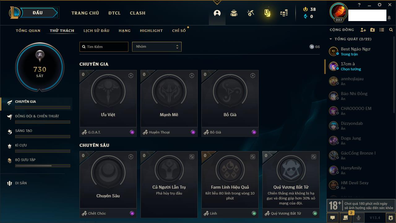 Rank Đơn: Vàng IIIKhung: BạcTướng: 171 - Còn 101359 THXTrang Phục: 88Rank ĐTCL: Kim Cương IVLinh Thú: 200