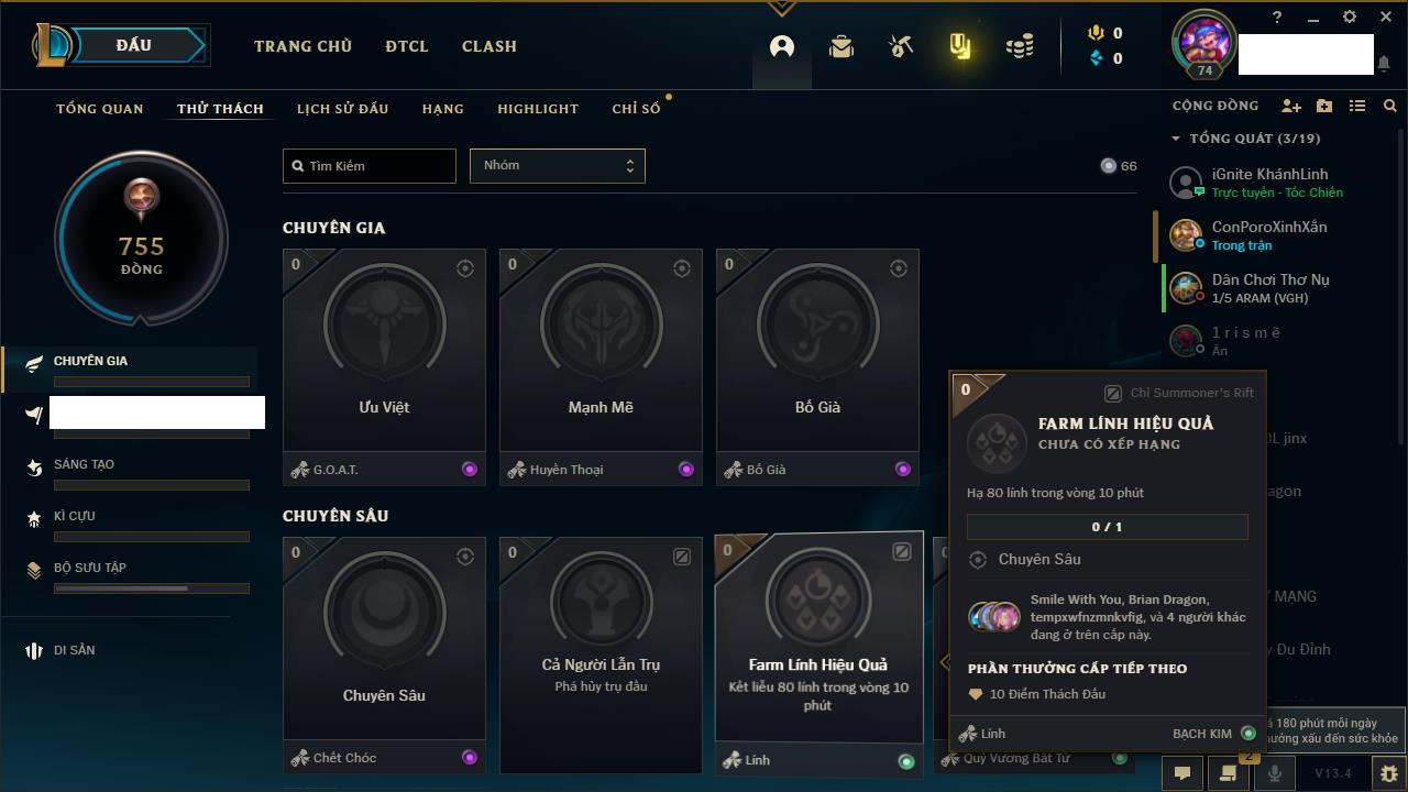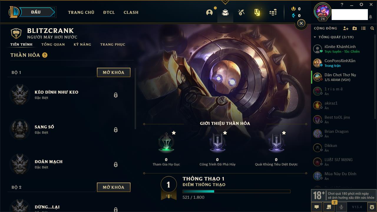 Rank Đơn: Lục Bảo IVKhung: VàngTướng: 171 - Còn 154648 THXTrang Phục: 203Rank ĐTCL: Bạch Kim IVLinh Thú: 69
