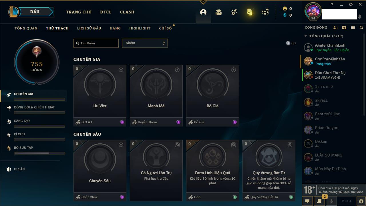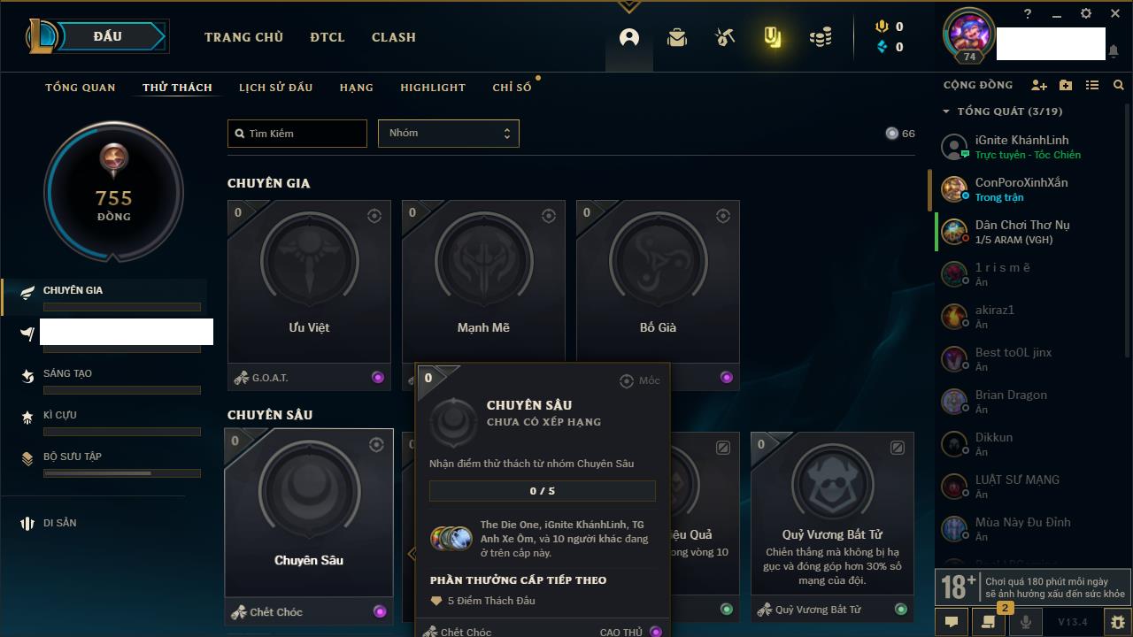 Rank Đơn: Bạch Kim IIKhung: Bạch kimTướng: 171 - Còn 316137 THXTrang Phục: 89Rank ĐTCL: Bạch Kim IIILinh Thú: 94