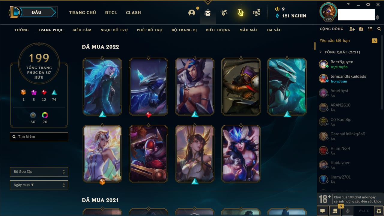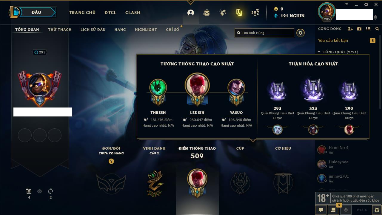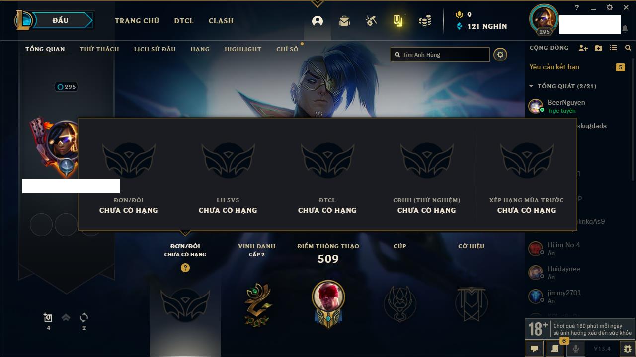 Rank Đơn: Bạch Kim IIKhung: Bạch kimTướng: 171 - Còn 97913 THXTrang Phục: 261Rank ĐTCL: Chưa RankLinh Thú: 46