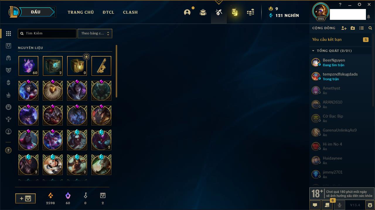 Rank Đơn: Vàng IIIKhung: VàngTướng: 172 - Còn 164704 THXTrang Phục: 255Rank ĐTCL: Kim Cương IVLinh Thú: 156