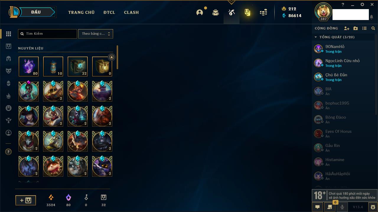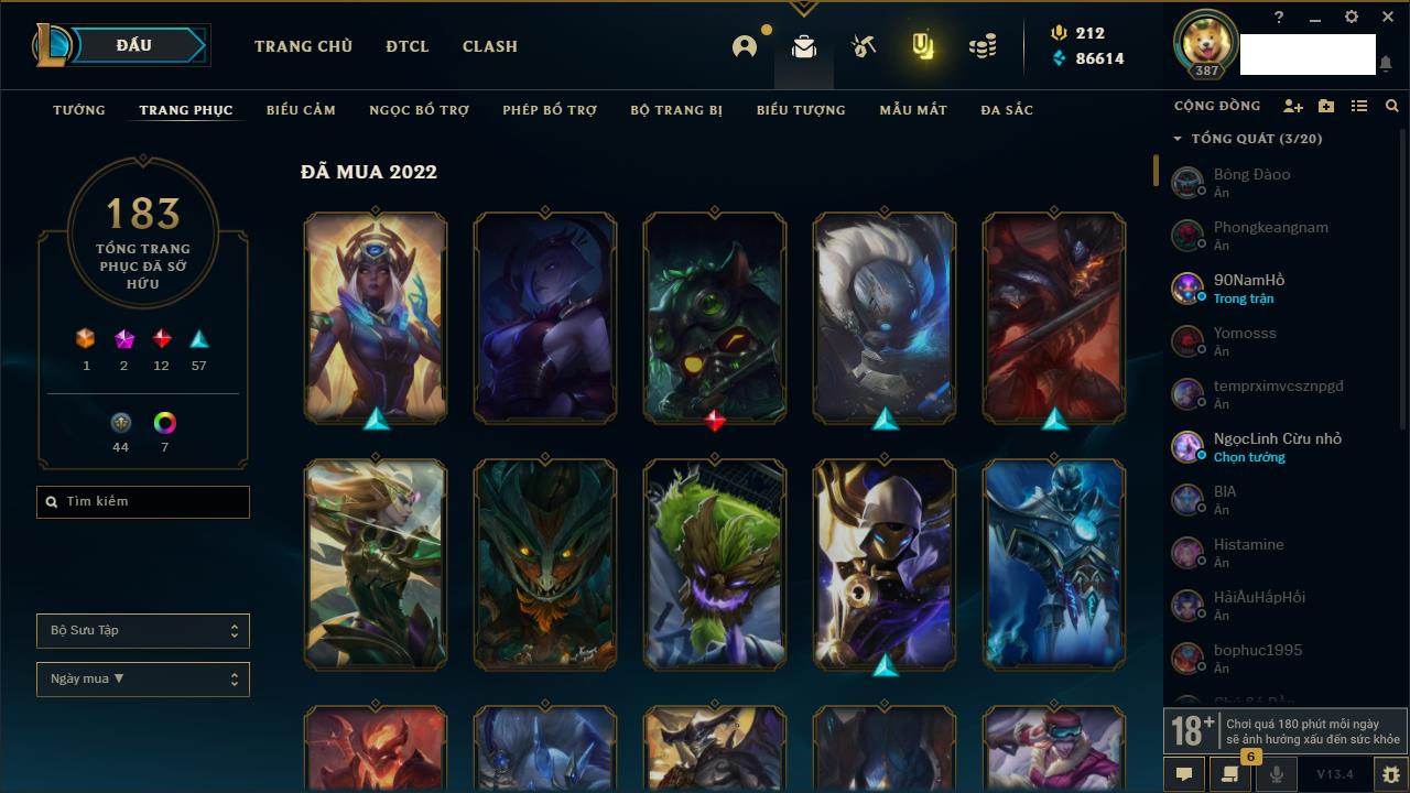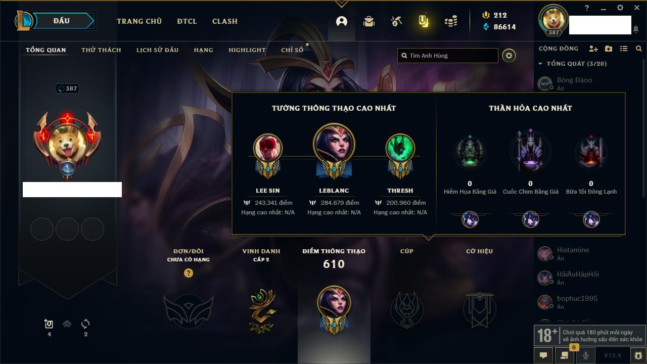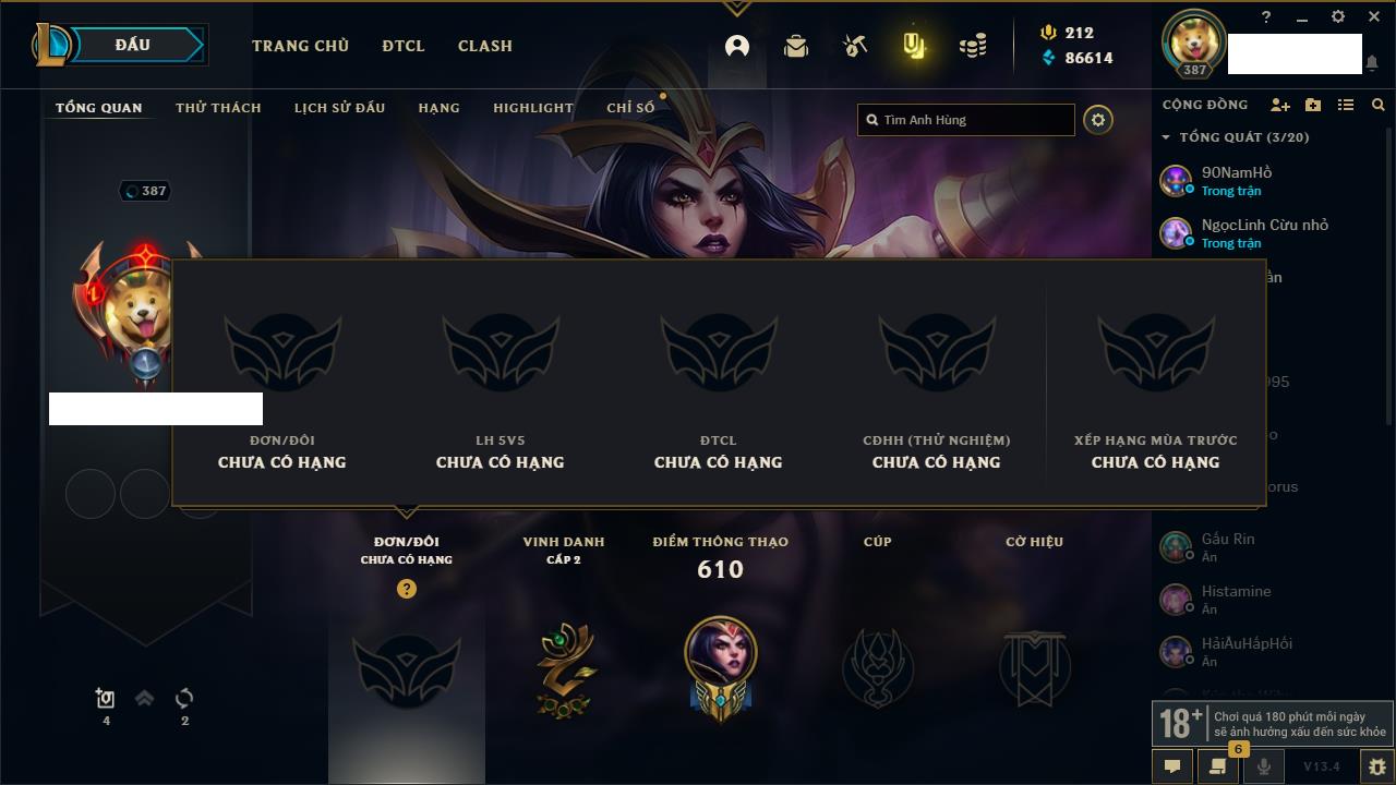 Rank Đơn: Đồng IIKhung: Chưa có khungTướng: 170 - Còn 56487 THXTrang Phục: 90Rank ĐTCL: Chưa RankLinh Thú: 129