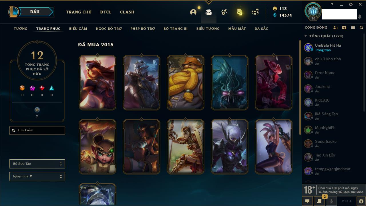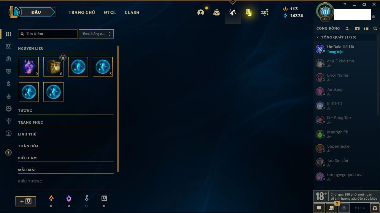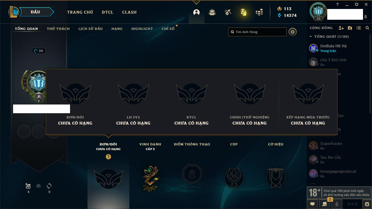 Rank Đơn: Sắt IIIKhung: Chưa có khungTướng: 49 - Còn 11000 THXTrang Phục: 6Rank ĐTCL: Chưa RankLinh Thú: 131