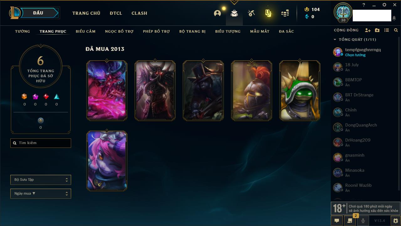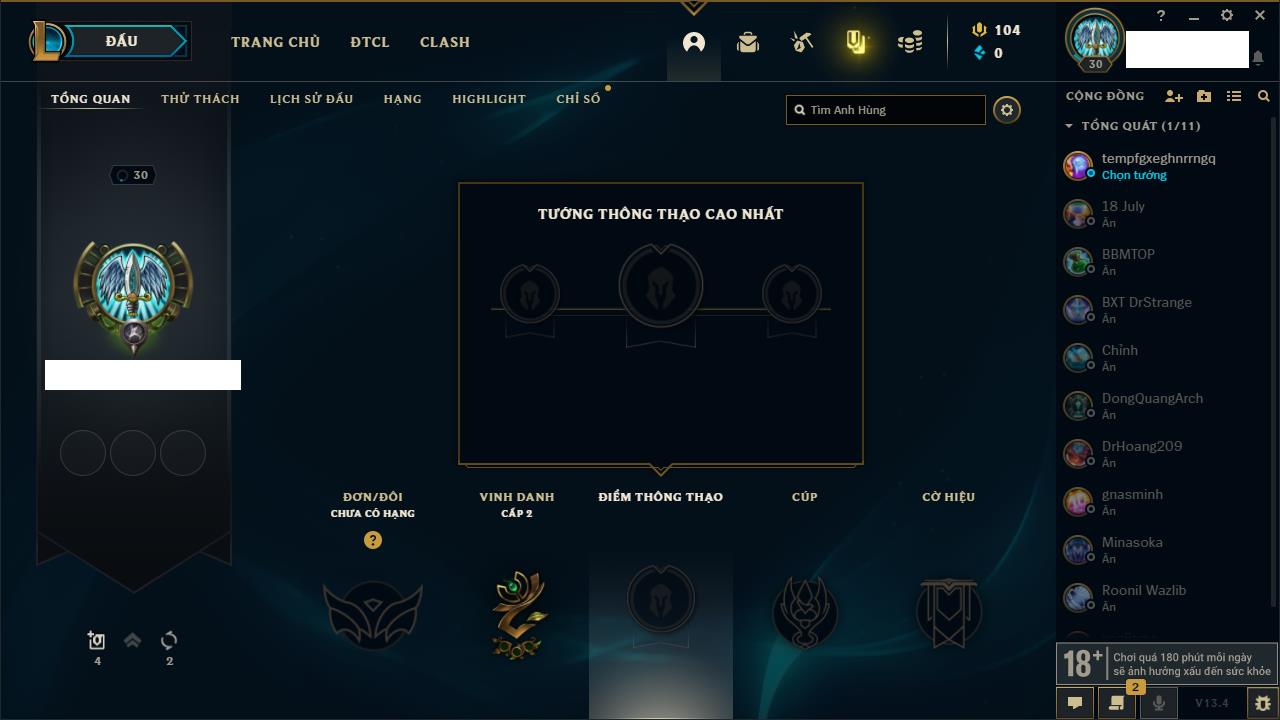 Rank Đơn: Chưa rank mùa nào Khung: Chưa có khung Tướng: 166 - Còn 3090 THX Trang Phục: 9 Rank ĐTCL: Chưa Rank Linh Thú: 125