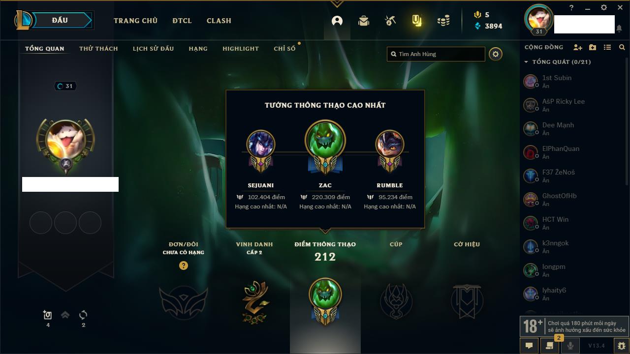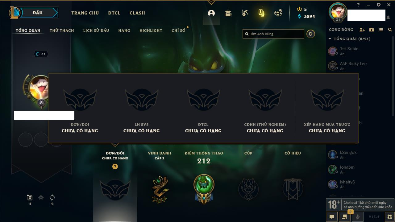 Rank Đơn: Bạch Kim IIKhung: Bạch kimTướng: 171 - Còn 141298 THXTrang Phục: 274Rank ĐTCL: Bạch Kim IILinh Thú: 188