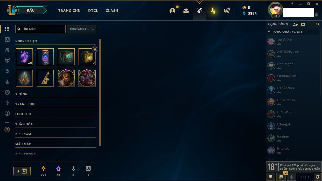 Rank Đơn: Vàng IKhung: BạcTướng: 171 - Còn 60584 THXTrang Phục: 286Rank ĐTCL: Vàng IIILinh Thú: 117