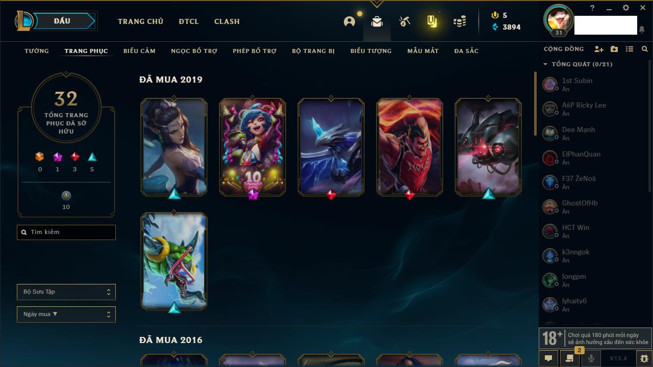 Rank Đơn: Vàng IIIKhung: VàngTướng: 171 - Còn 88128 THXTrang Phục: 329Rank ĐTCL: Chưa RankLinh Thú: 41