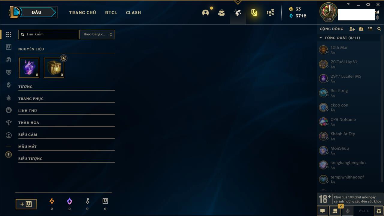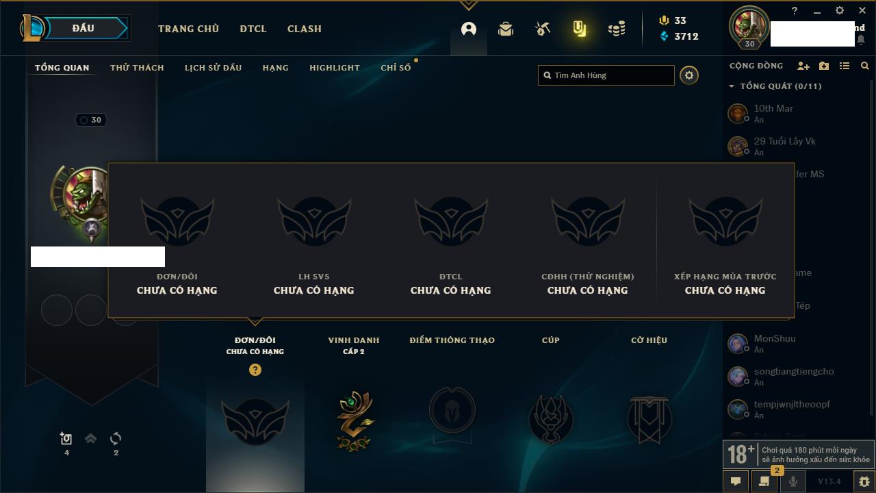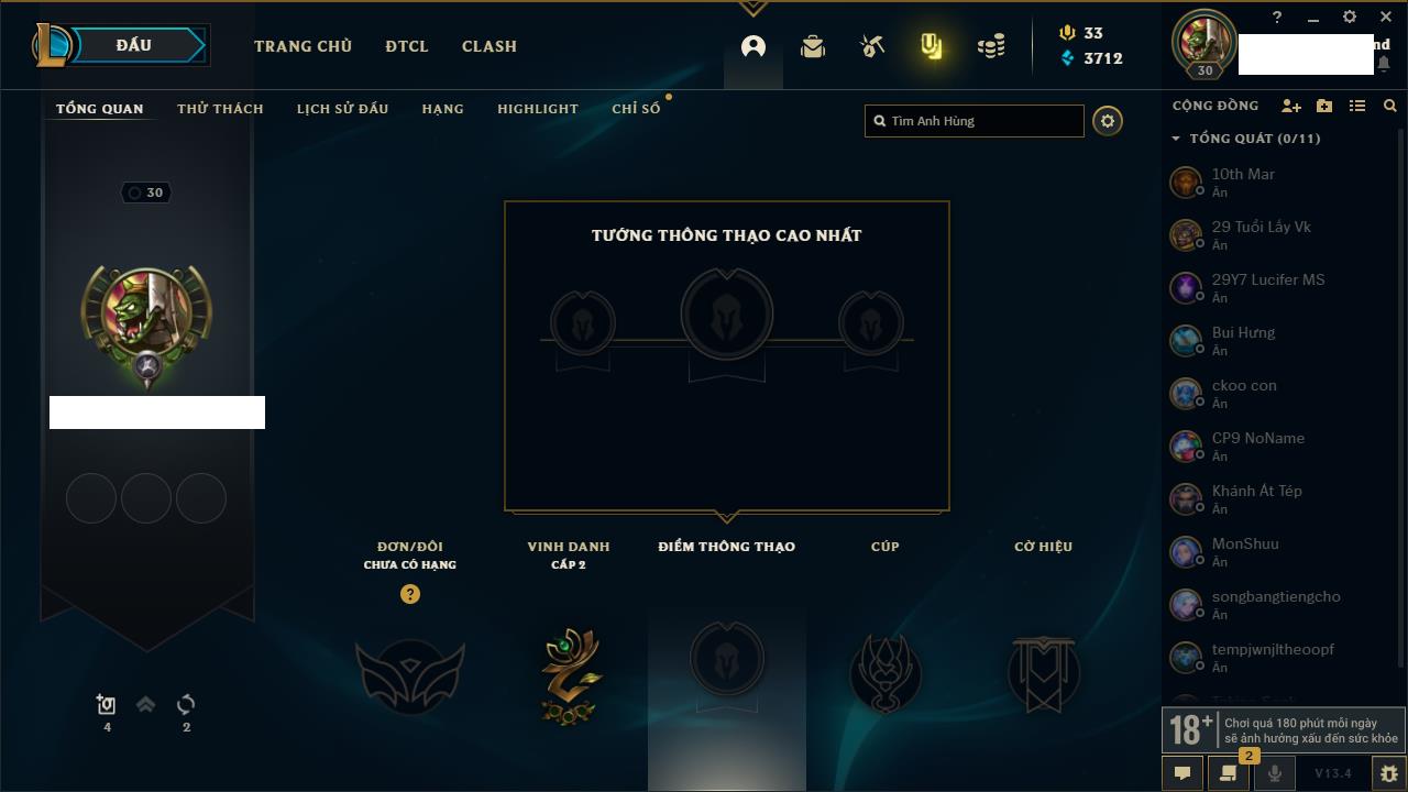 Rank Đơn: Chưa RankKhung: Chưa có khungTướng: 0 - Còn 0 THXTrang Phục: 0Rank ĐTCL: Chưa RankLinh Thú: 8