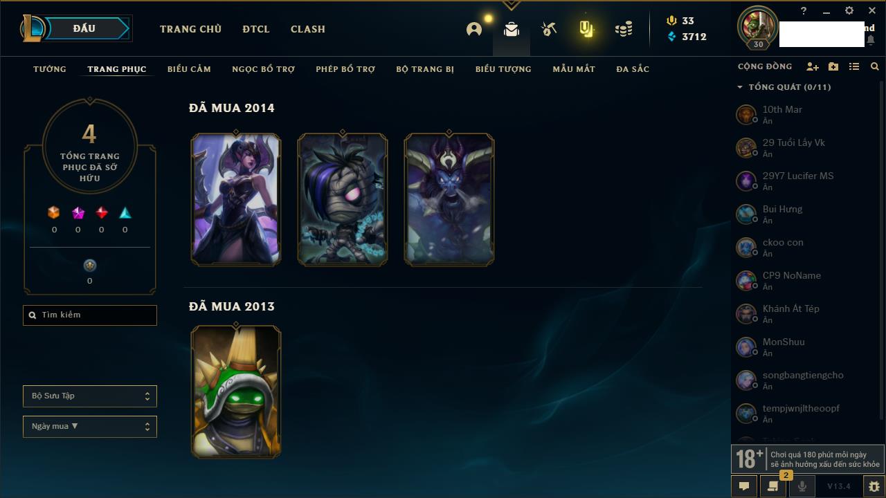 Rank Đơn: Chưa RankKhung: Chưa có khungTướng: 76 - Còn 3157 THXTrang Phục: 7Rank ĐTCL: Chưa RankLinh Thú: 100