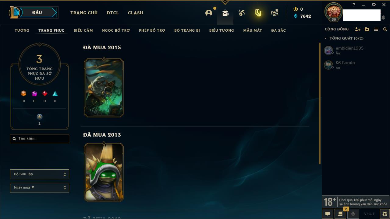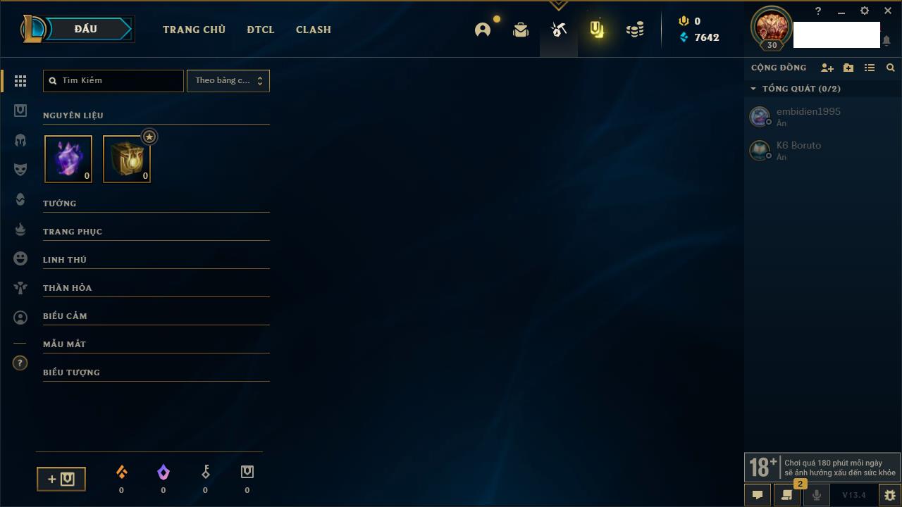 Rank Đơn: Sắt IIIKhung: Chưa có khungTướng: 49 - Còn 11000 THXTrang Phục: 6Rank ĐTCL: Chưa RankLinh Thú: 131