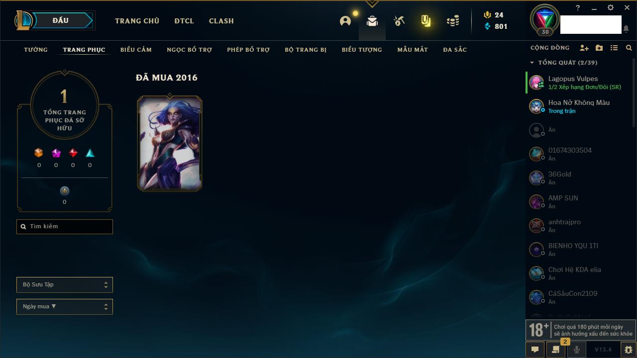 Rank Đơn: Chưa RankKhung: Chưa có khungTướng: 79 - Còn 2490 THXTrang Phục: 2Rank ĐTCL: Chưa RankLinh Thú: 26