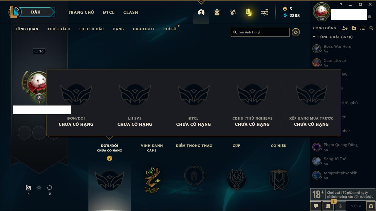 Rank Đơn: Chưa RankKhung: Chưa có khungTướng: 3 - Còn 34550 THXTrang Phục: 0Rank ĐTCL: Chưa RankLinh Thú: 41
