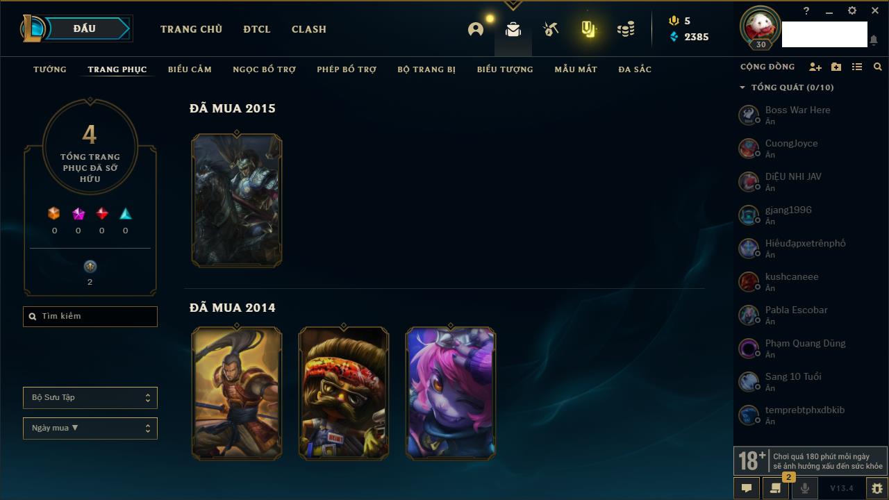 Rank Đơn: Chưa RankKhung: Chưa có khungTướng: 79 - Còn 2490 THXTrang Phục: 2Rank ĐTCL: Chưa RankLinh Thú: 26