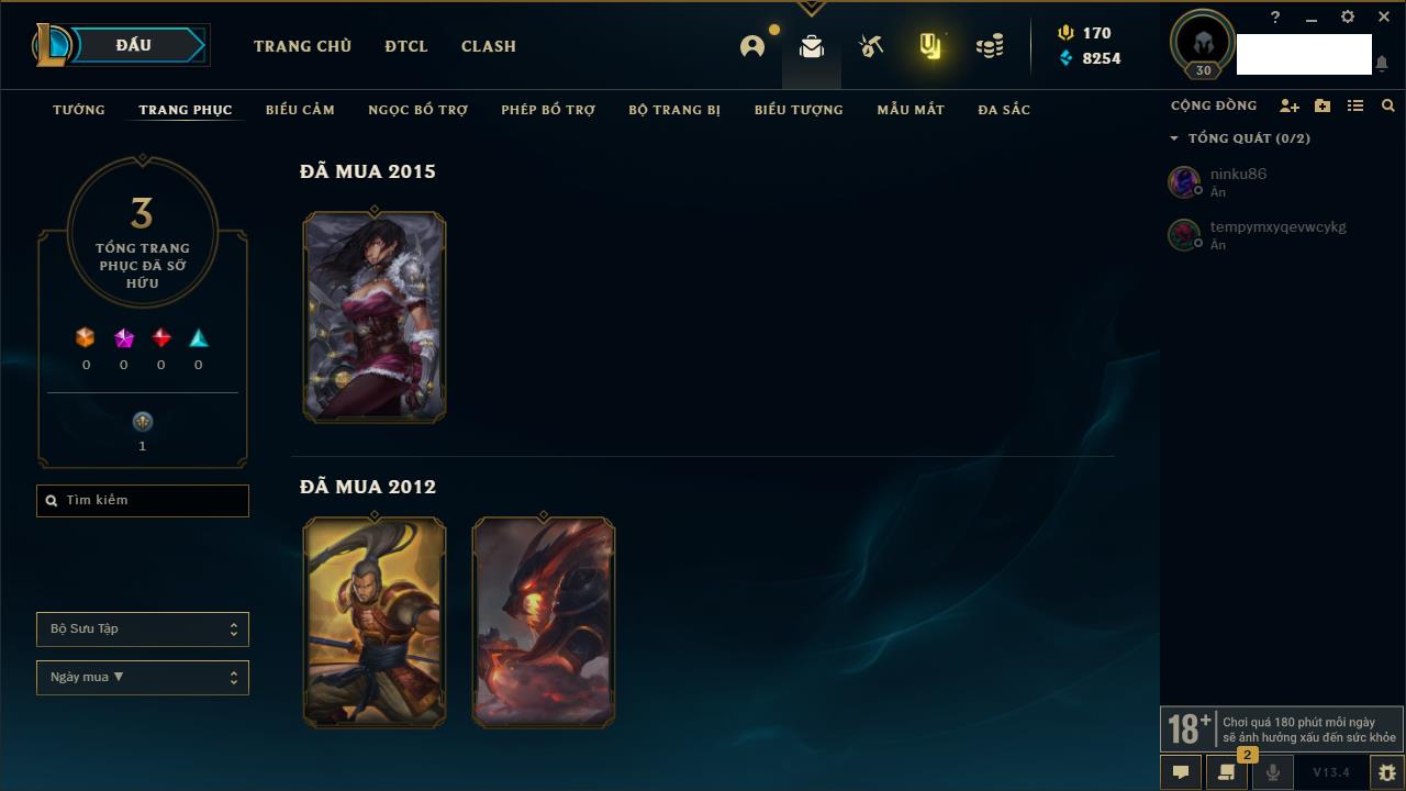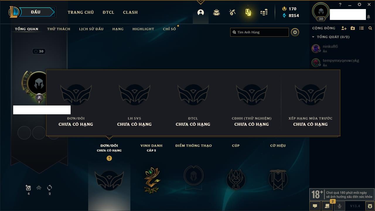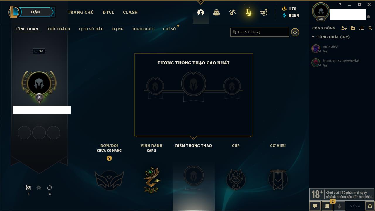 Rank Đơn: Sắt IIIKhung: Chưa có khungTướng: 49 - Còn 11000 THXTrang Phục: 6Rank ĐTCL: Chưa RankLinh Thú: 131
