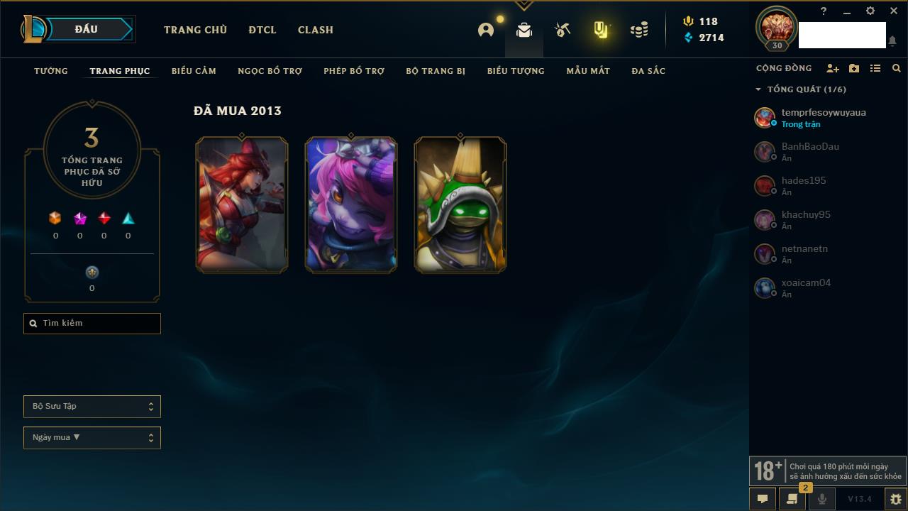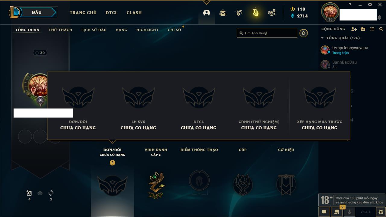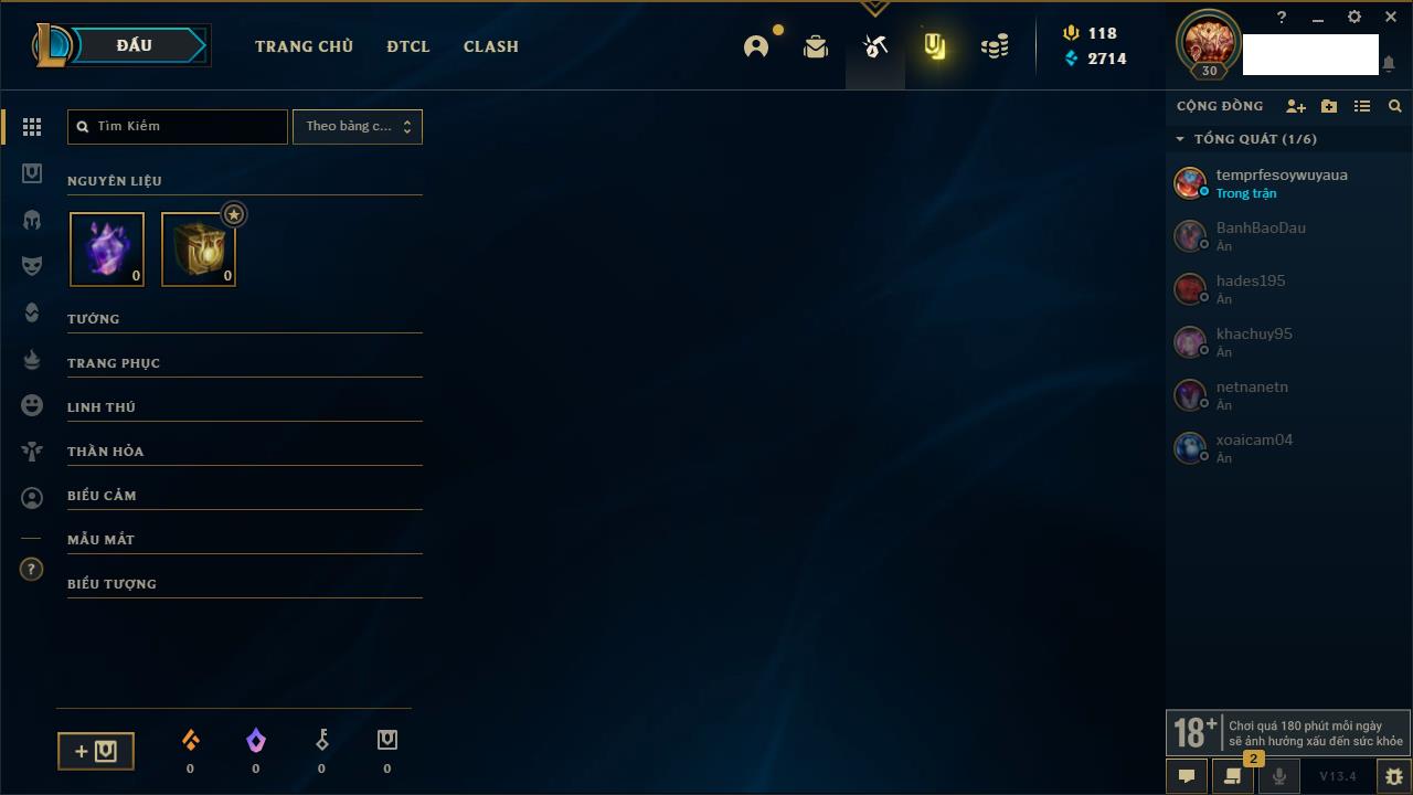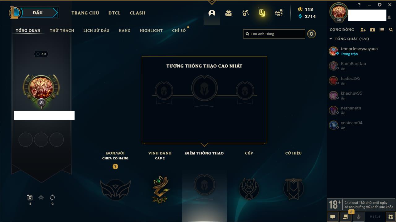 Rank Đơn: Chưa rank mùa nàoKhung: Chưa có khungTướng: 0 - Còn 4000 THXTrang Phục: 0Rank ĐTCL: Chưa rank mùa nàoLinh Thú: 18
