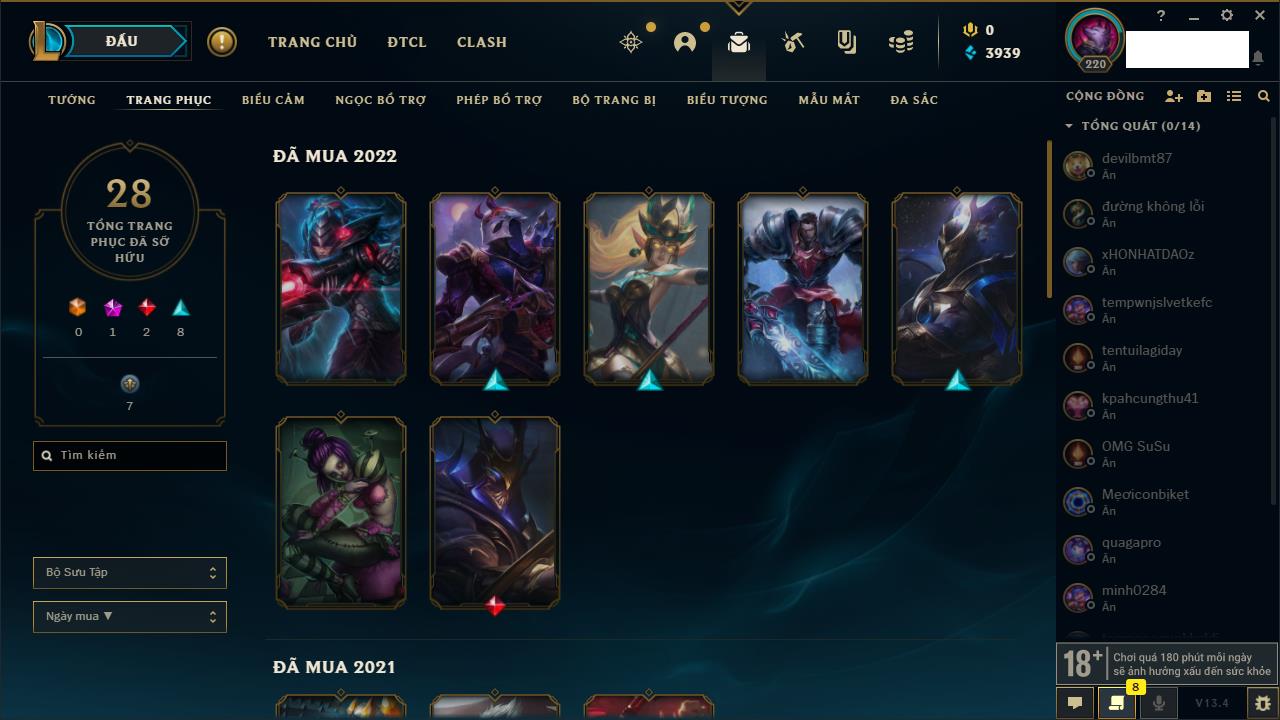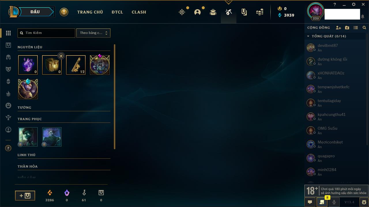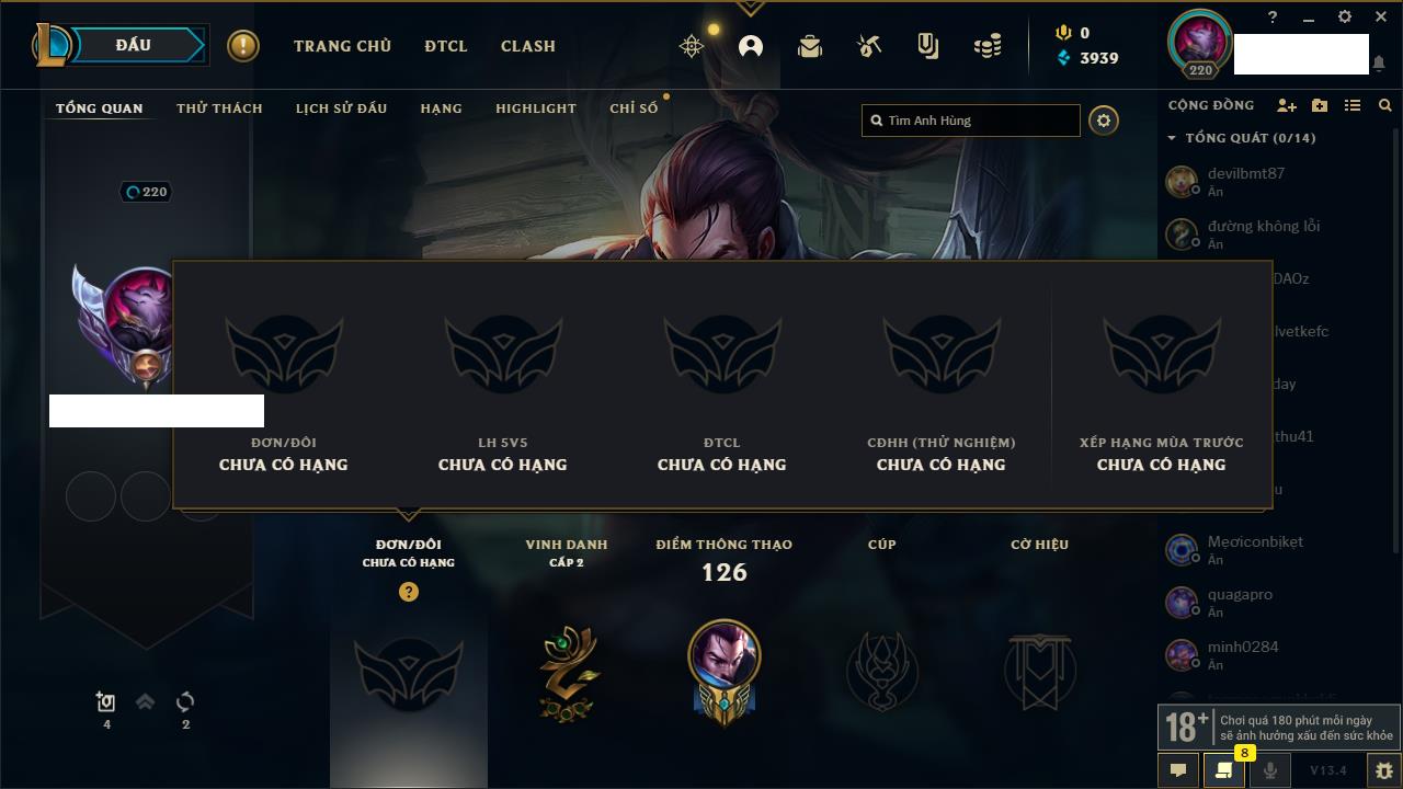 Rank Đơn: Vàng IIIKhung: BạcTướng: 171 - Còn 101359 THXTrang Phục: 88Rank ĐTCL: Kim Cương IVLinh Thú: 200