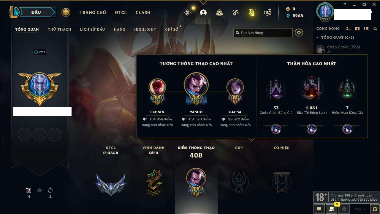 Rank Đơn: Chưa rank mùa nàoKhung: Chưa có khungTướng: 0 - Còn 2000 THXTrang Phục: 0Rank ĐTCL: Chưa RankLinh Thú: 14