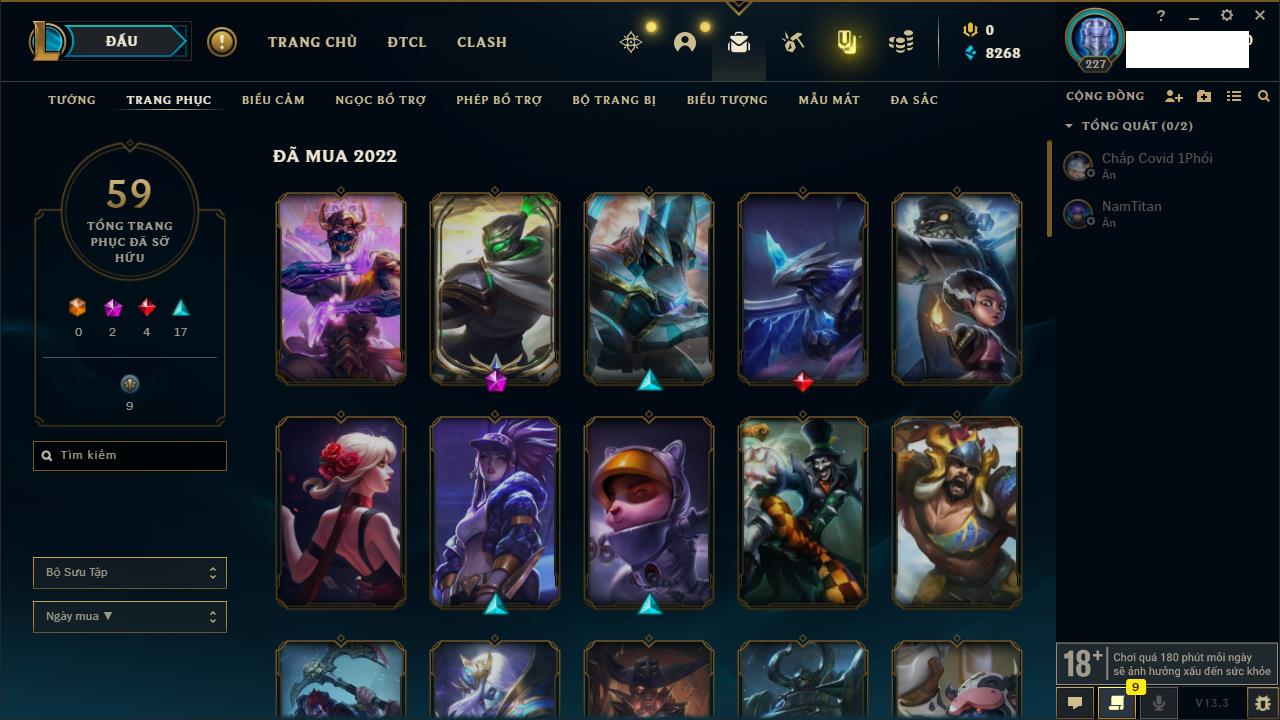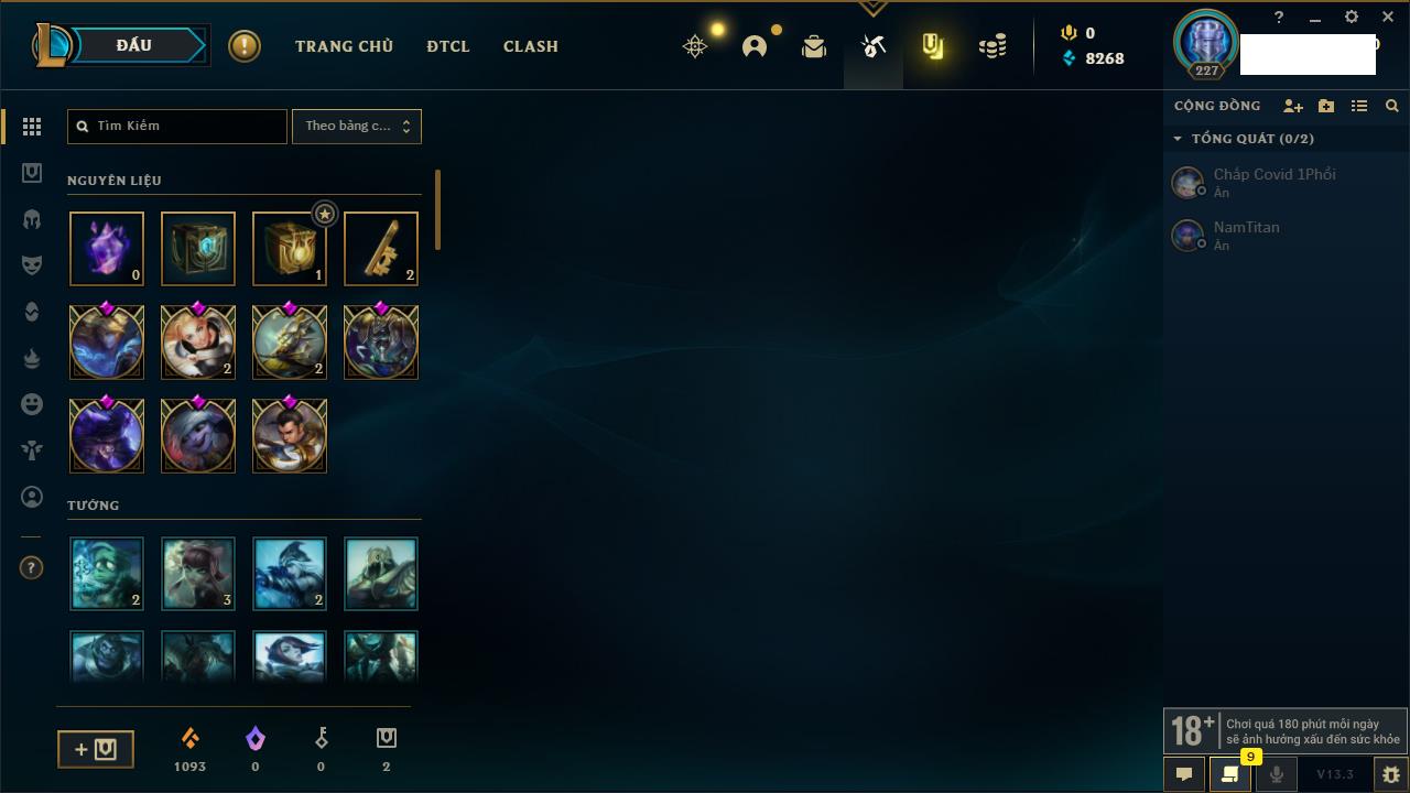 Rank Đơn: Chưa RankKhung: Chưa có khungTướng: 162 - Còn 23234 THXTrang Phục: 150Rank ĐTCL: Chưa RankLinh Thú: 42