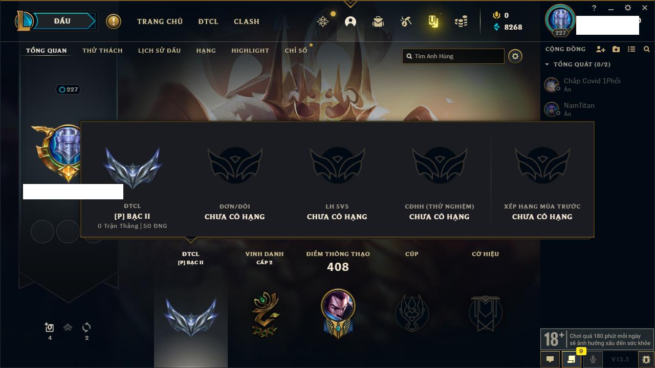 Rank Đơn: Chưa RankKhung: BạcTướng: 141 - Còn 299 THXTrang Phục: 101Rank ĐTCL: Chưa RankLinh Thú: 84