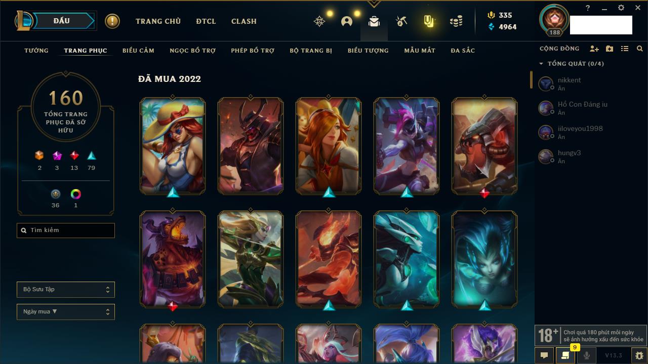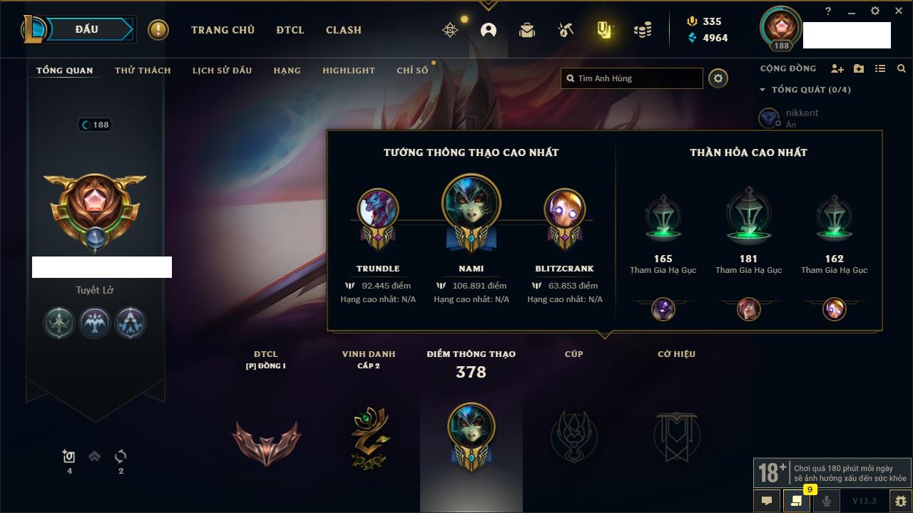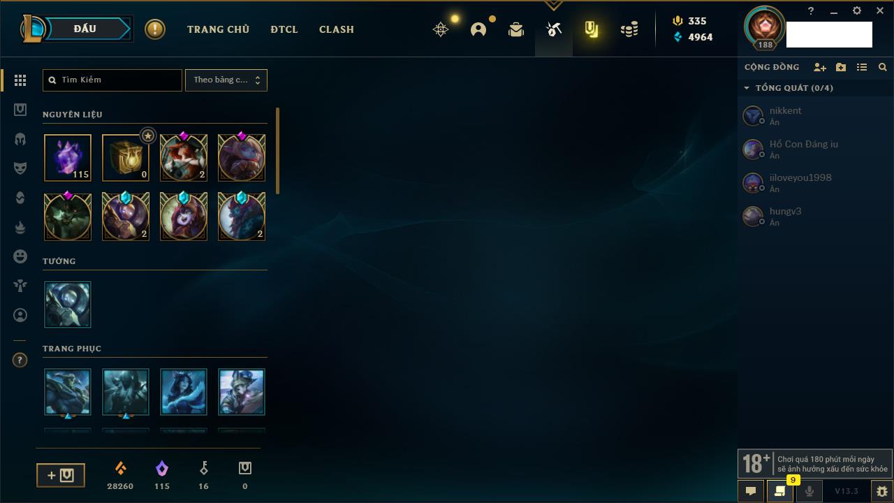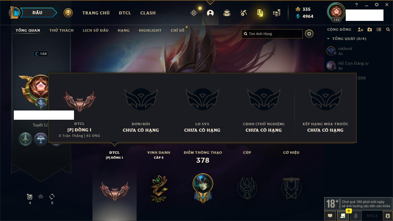 Rank Đơn: Đồng IIKhung: Chưa có khungTướng: 170 - Còn 56487 THXTrang Phục: 90Rank ĐTCL: Chưa RankLinh Thú: 129