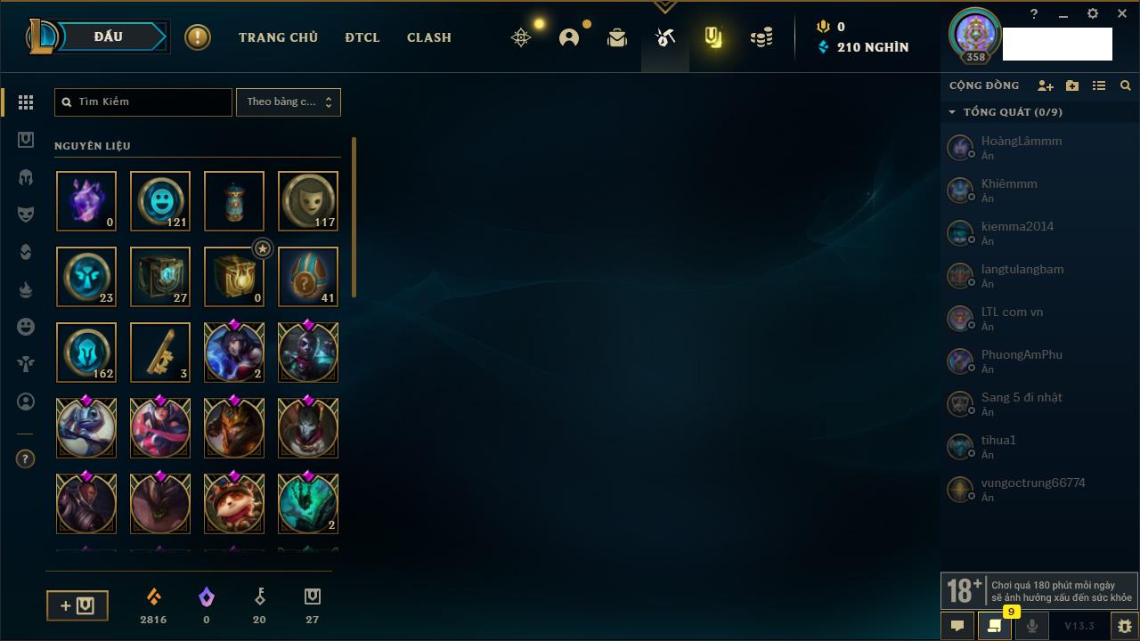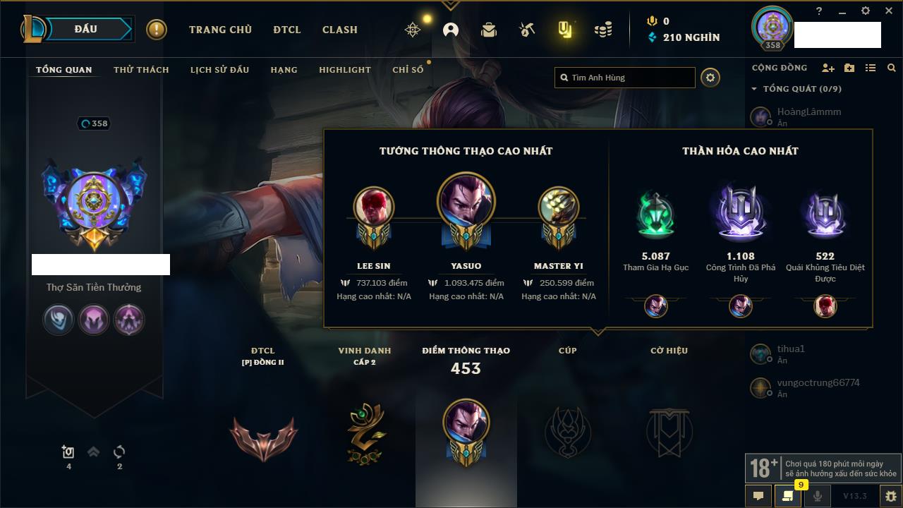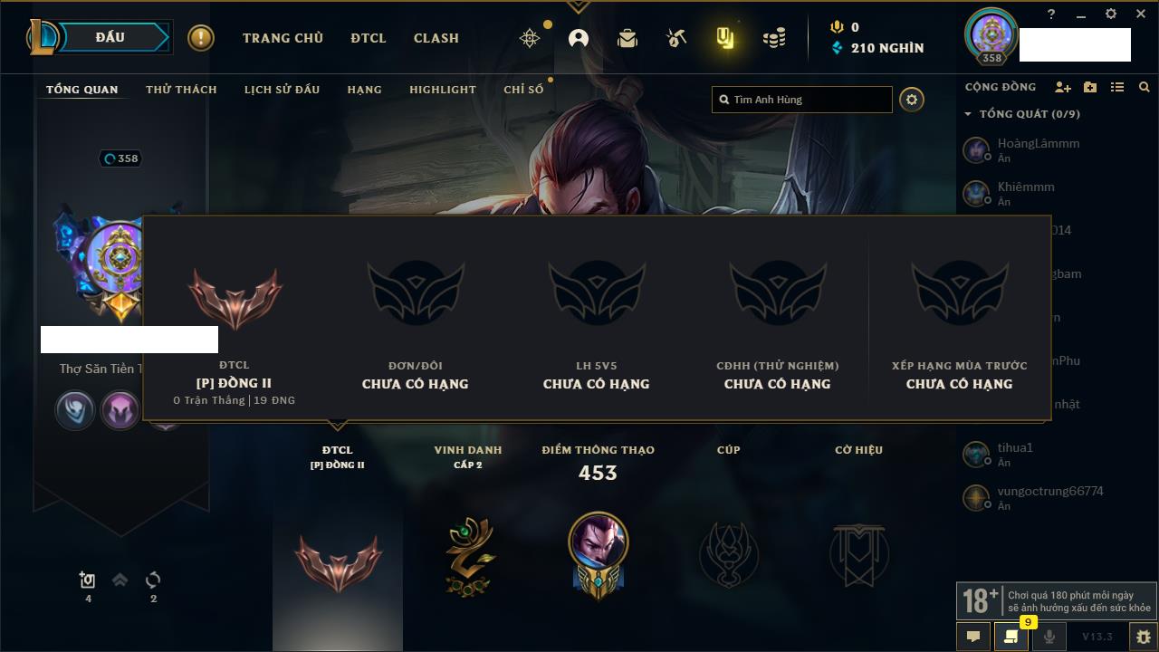 Rank Đơn: Bạch Kim IIIKhung: Bạch kimTướng: 171 - Còn 210697 THXTrang Phục: 220Rank ĐTCL: Bạc IVLinh Thú: 51