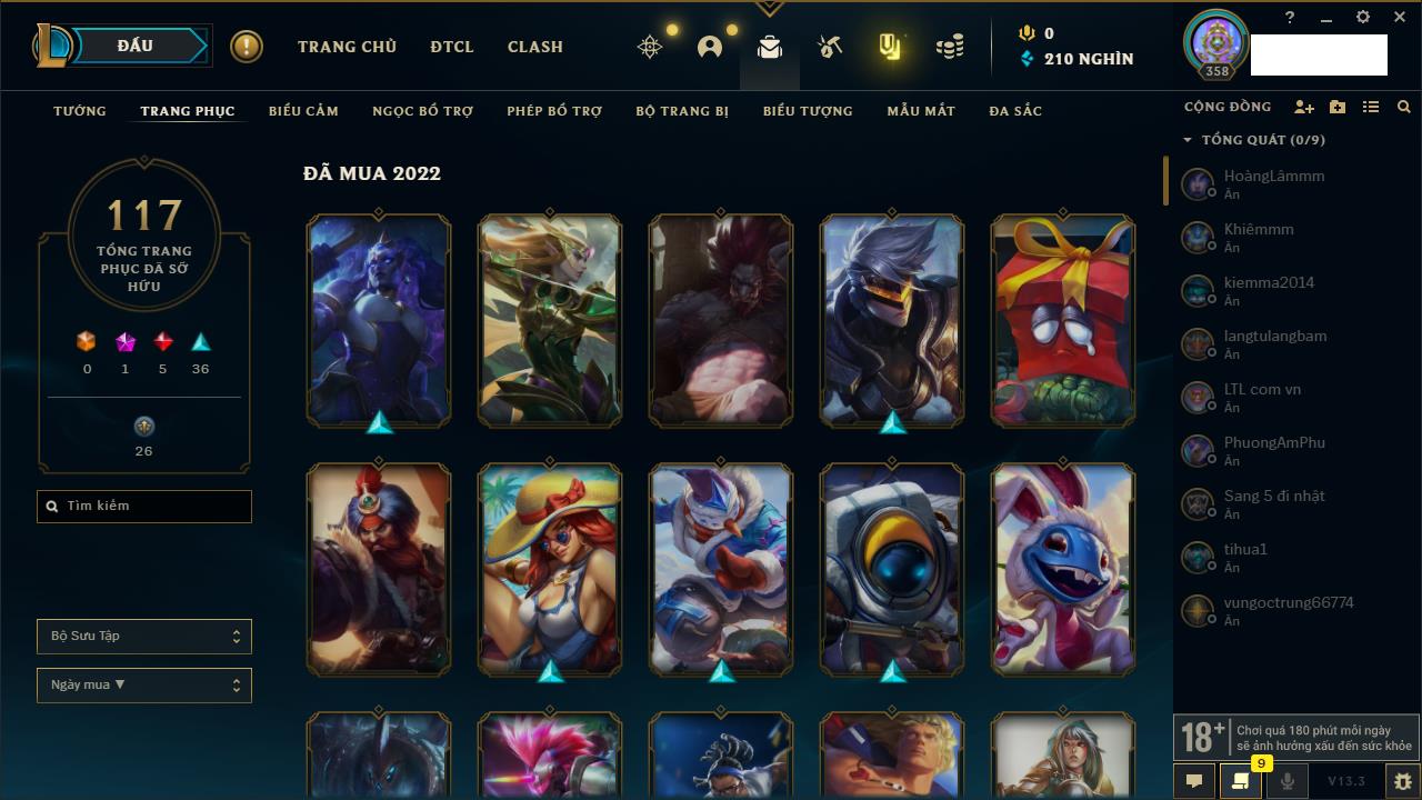 Rank Đơn: Chưa RankKhung: Chưa có khungTướng: 167 - Còn 4966 THXTrang Phục: 239Rank ĐTCL: Chưa RankLinh Thú: 52
