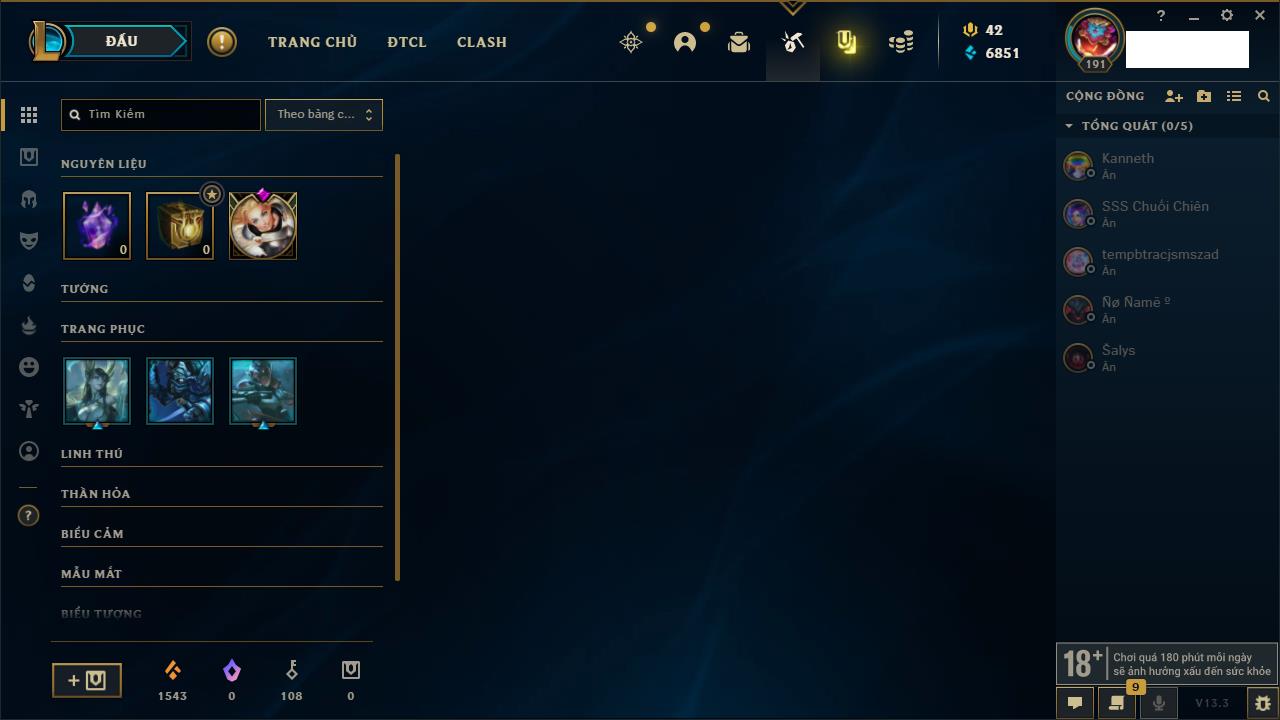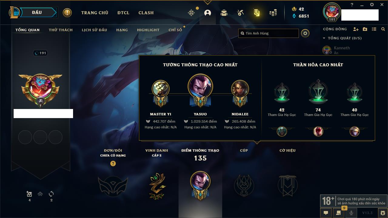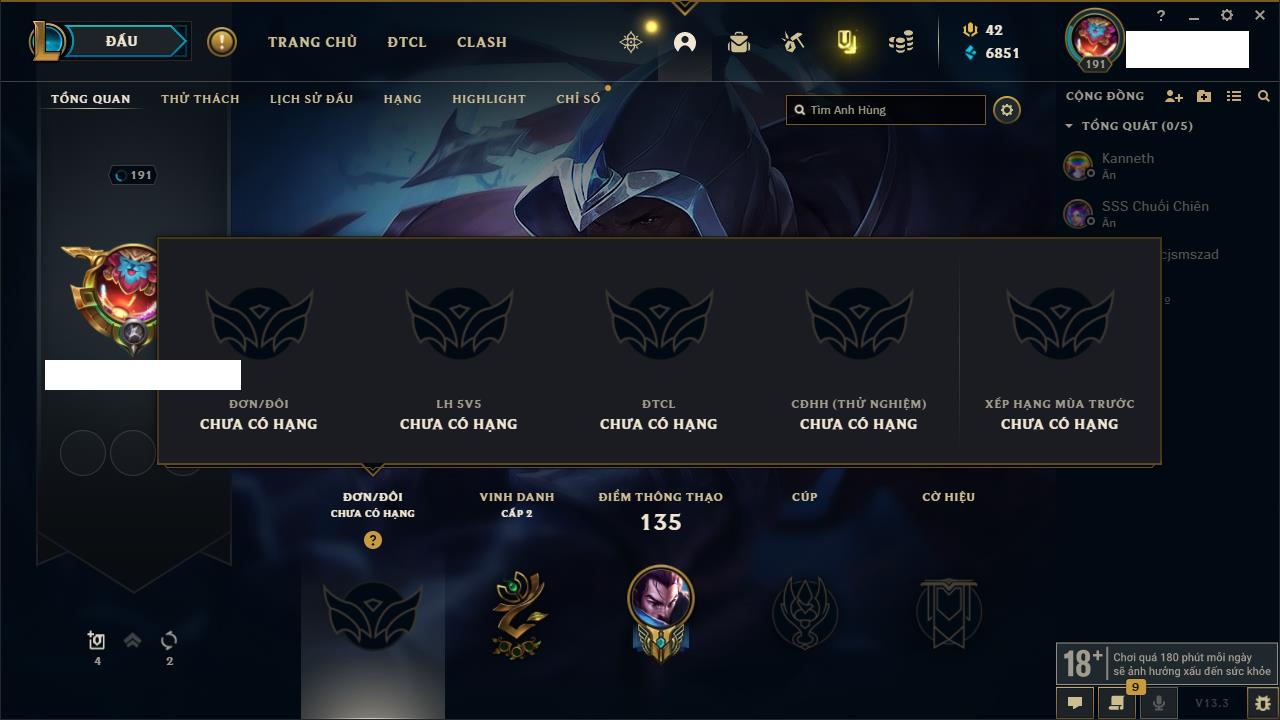 Rank Đơn: Vàng IIIKhung: BạcTướng: 171 - Còn 101359 THXTrang Phục: 88Rank ĐTCL: Kim Cương IVLinh Thú: 200