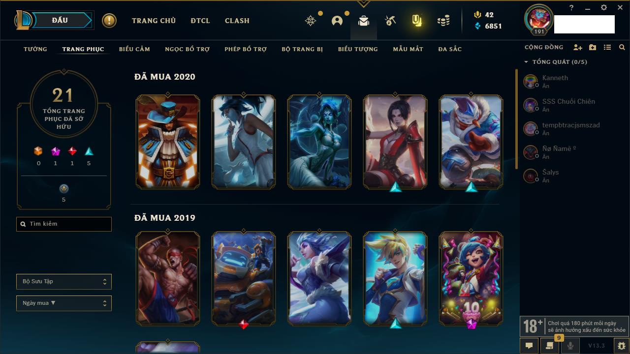 Rank Đơn: Vàng IVKhung: VàngTướng: 171 - Còn 56632 THXTrang Phục: 215Rank ĐTCL: Bạc ILinh Thú: 71