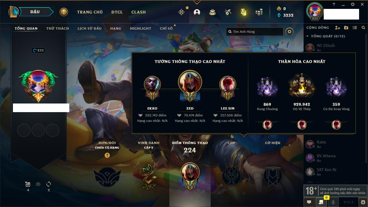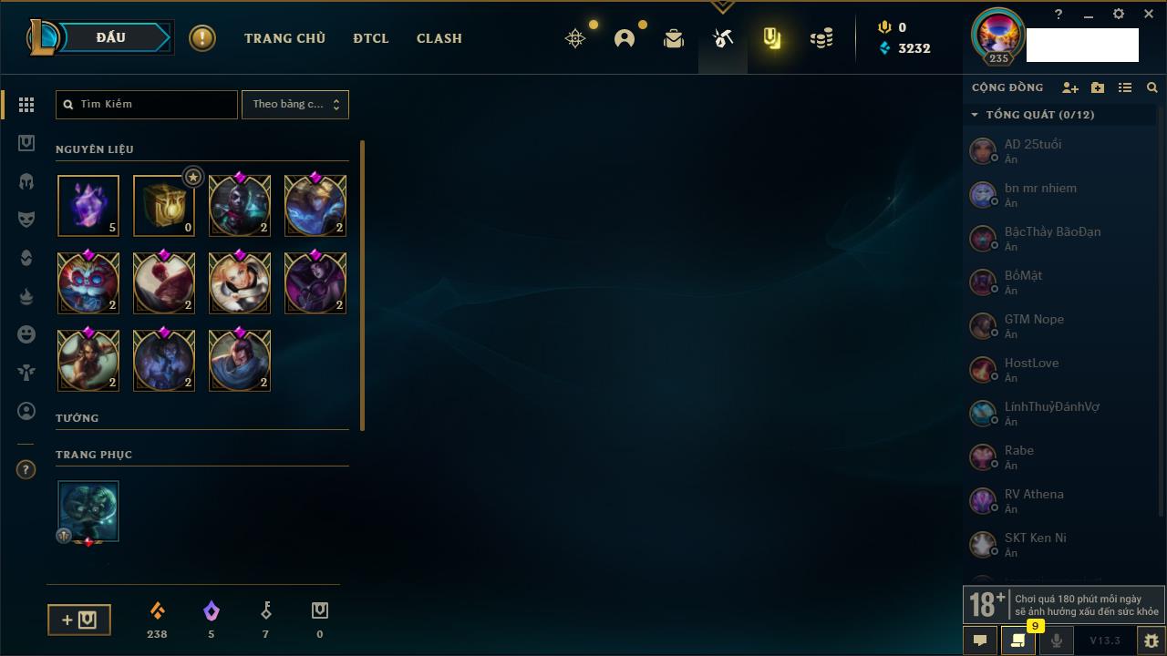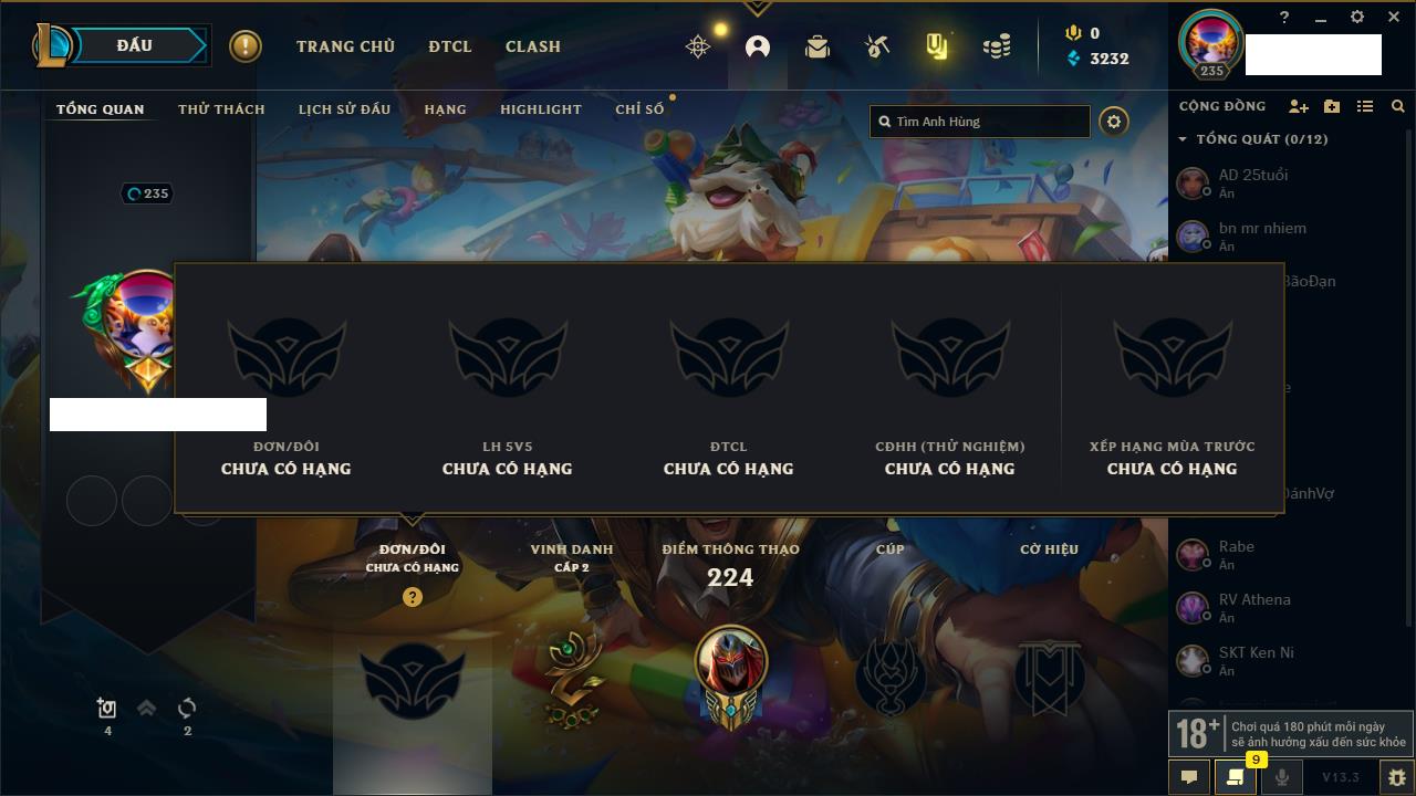 Rank Đơn: Chưa RankKhung: Chưa có khungTướng: 157 - Còn 6783 THXTrang Phục: 50Rank ĐTCL: Chưa RankLinh Thú: 37
