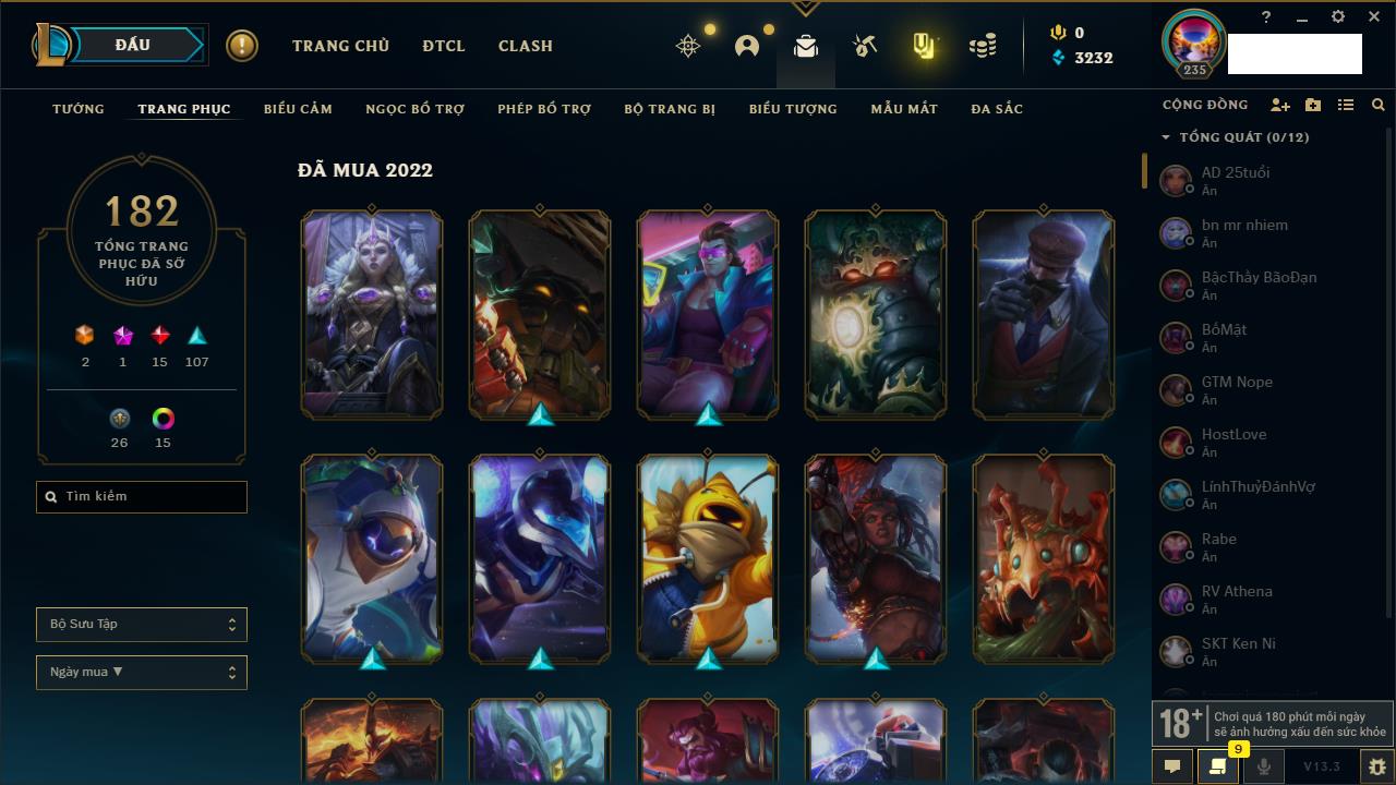Rank Đơn: Vàng IIIKhung: VàngTướng: 170 - Còn 33222 THXTrang Phục: 136Rank ĐTCL: Chưa RankLinh Thú: 40