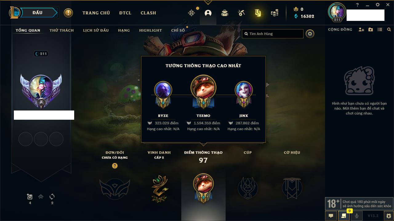 Rank Đơn: Đồng IIKhung: ĐồngTướng: 170 - Còn 66145 THXTrang Phục: 215Rank ĐTCL: Chưa RankLinh Thú: 52