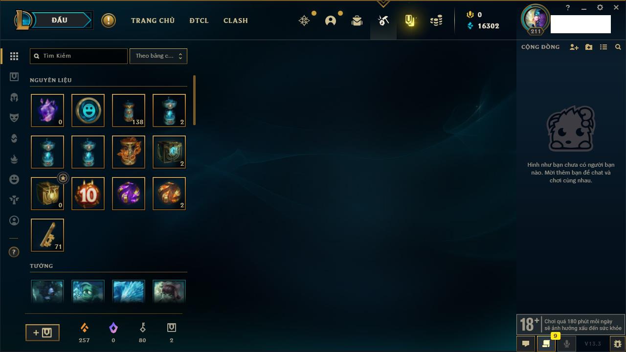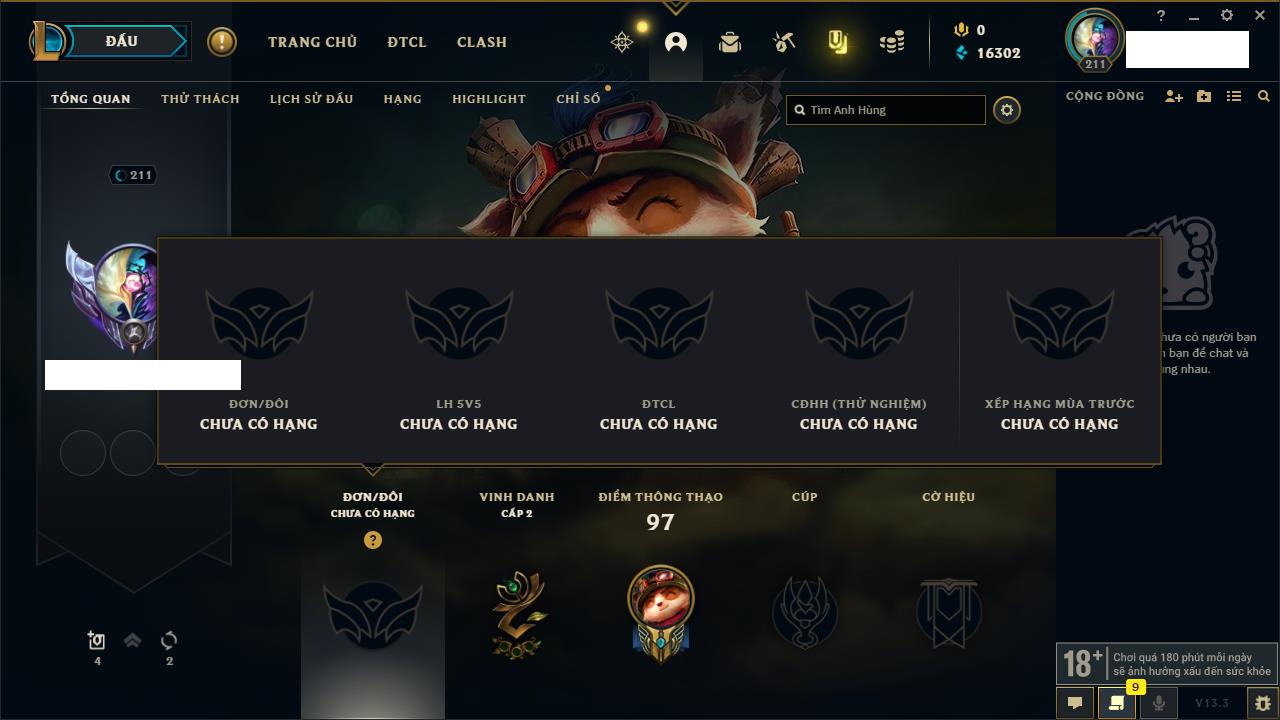 Rank Đơn: Vàng IIIKhung: BạcTướng: 171 - Còn 101359 THXTrang Phục: 88Rank ĐTCL: Kim Cương IVLinh Thú: 200