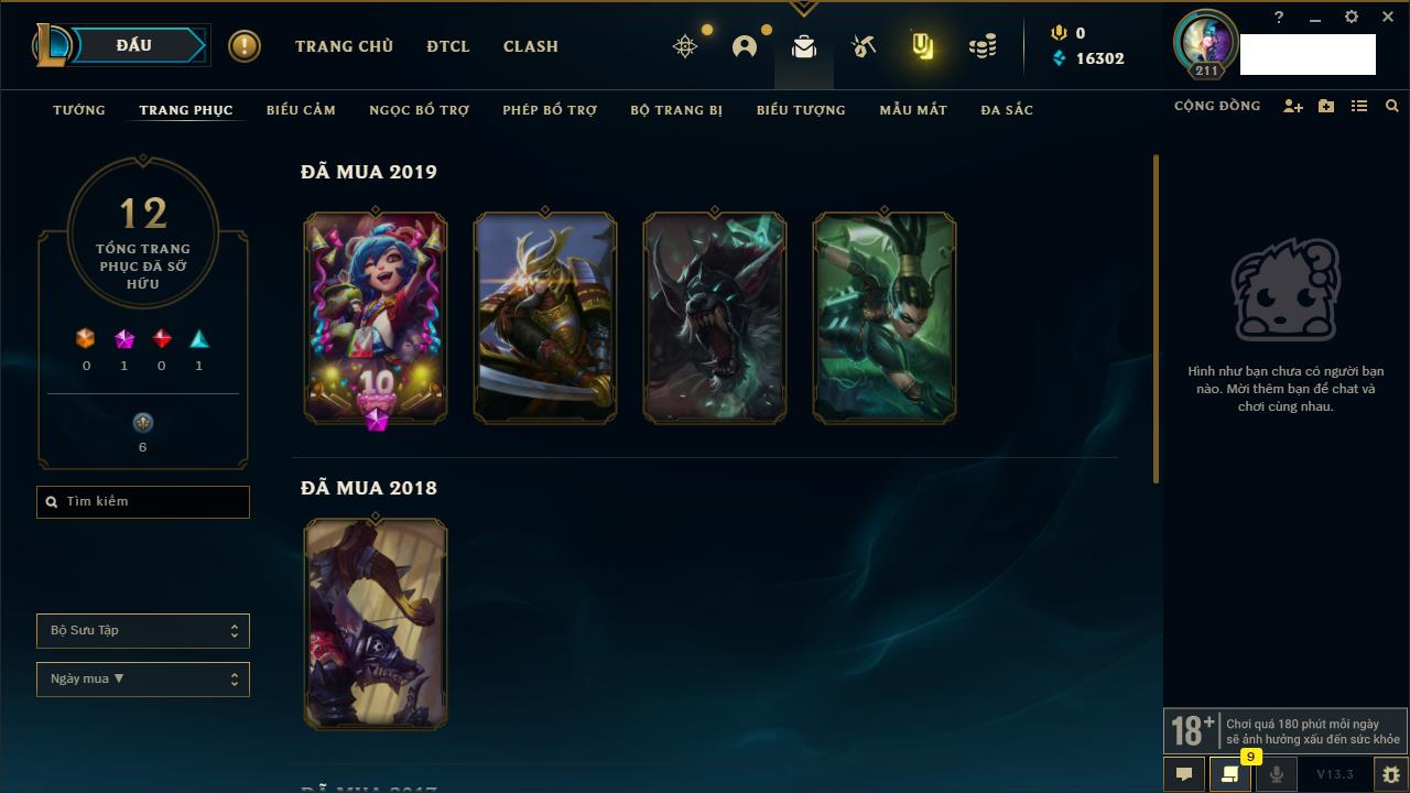 Rank Đơn: Đồng IKhung: ĐồngTướng: 168 - Còn 11447 THXTrang Phục: 245Rank ĐTCL: Chưa RankLinh Thú: 53
