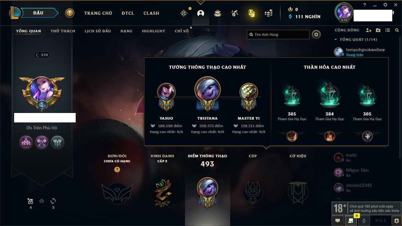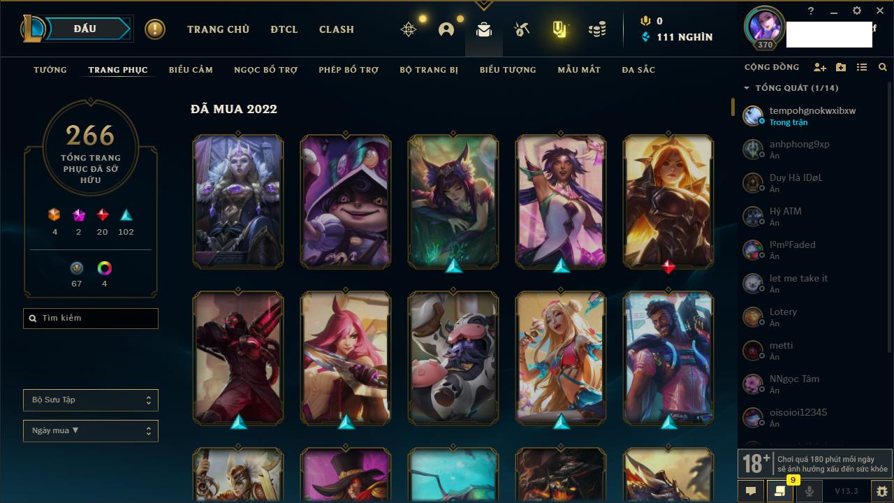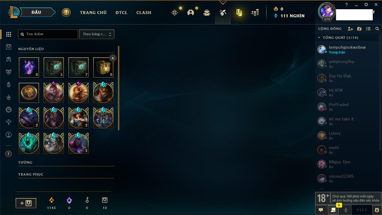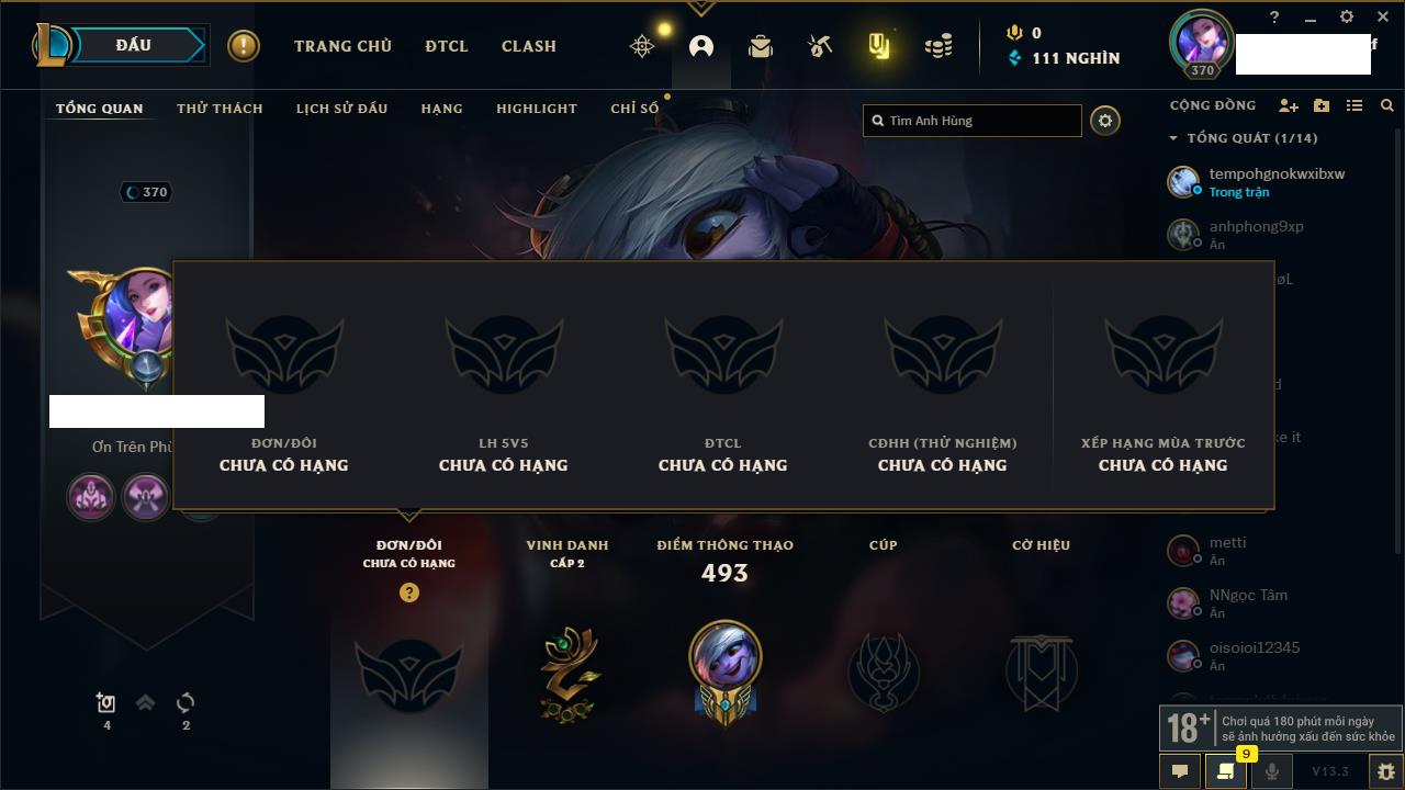 Rank Đơn: Vàng IIIKhung: BạcTướng: 171 - Còn 101359 THXTrang Phục: 88Rank ĐTCL: Kim Cương IVLinh Thú: 200
